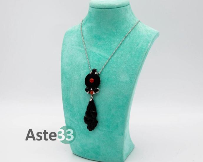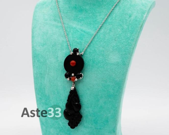 COLLANA IN ORO BIANCO CON PENDENTE IN ONICE, CORALLO E BRILLANTI.