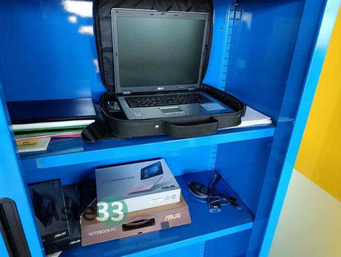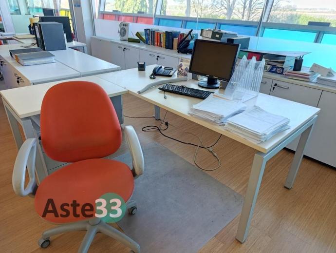 Scrivania ad elle, n. 2 mobili in metallo, mobile basso e computer