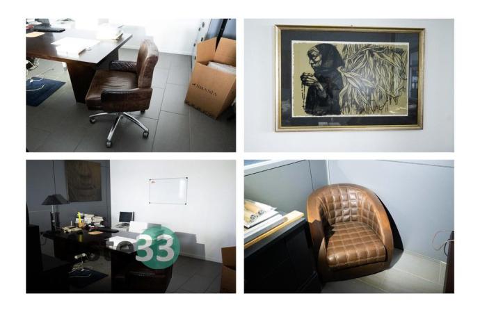 Arredamento per ufficio composto da scrivania, sedia in pelle stampa di coccodrillo, poltrona in quoio, sedia caprera, n. 2 quadri e mobilia