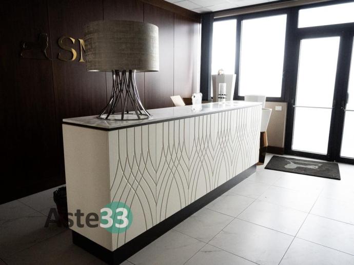 Arredamento per zona reception con bancone, divano, mobilia ed accessori per arredo