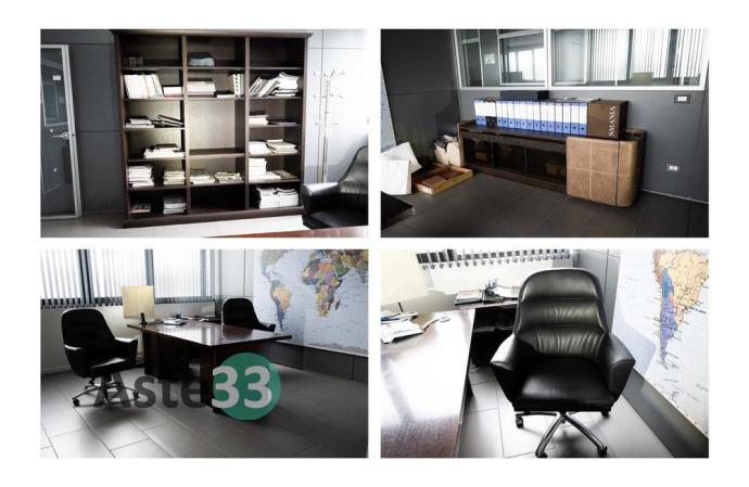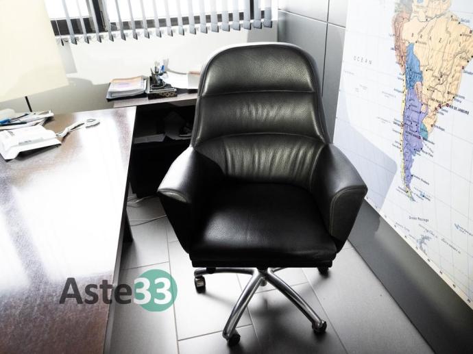 Arredamento per ufficio composto da mobile rivestito in pelle nocciola, scrivania, sedie e mobili