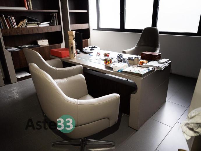 Arredamento per ufficio direzionale composto da scrivania rivestita in pelle grigia, n. 3 poltroncine rivestite in pelle grigia, quadro, mobili con rivestimento in pelle grigia