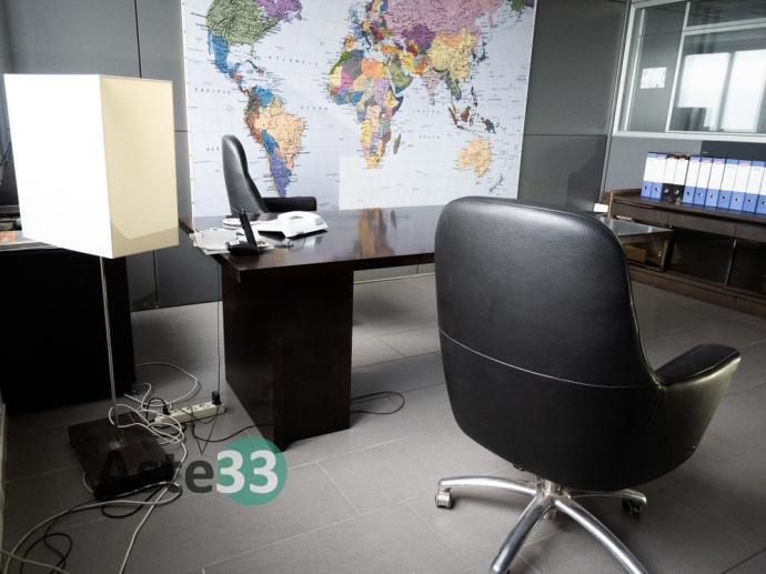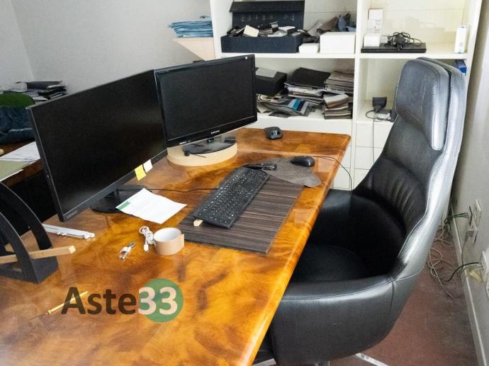 Arredamento per ufficio composto da mobile rivestito in pelle nocciola, scrivania, sedie e mobili
