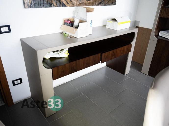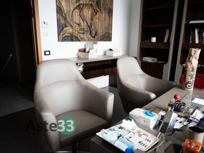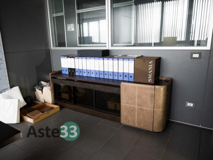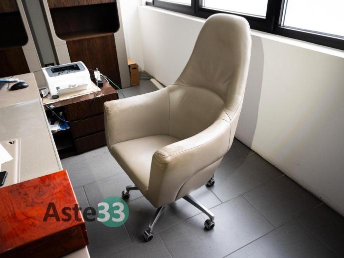 Arredamento per ufficio direzionale composto da scrivania rivestita in pelle grigia, n. 3 poltroncine rivestite in pelle grigia, quadro, mobili con rivestimento in pelle grigia