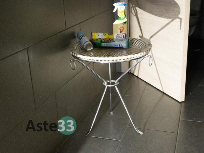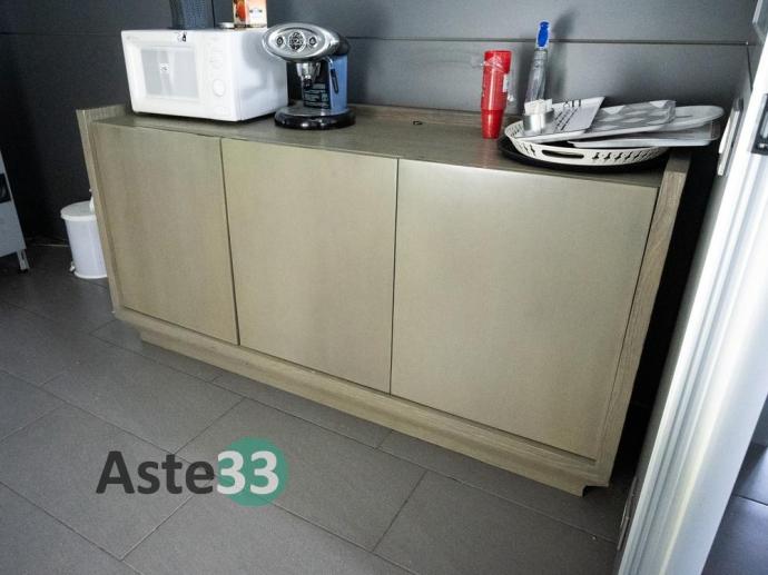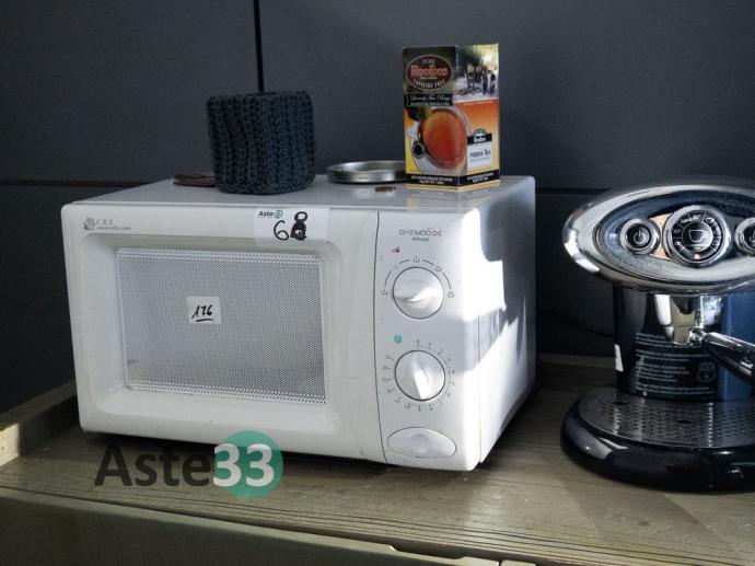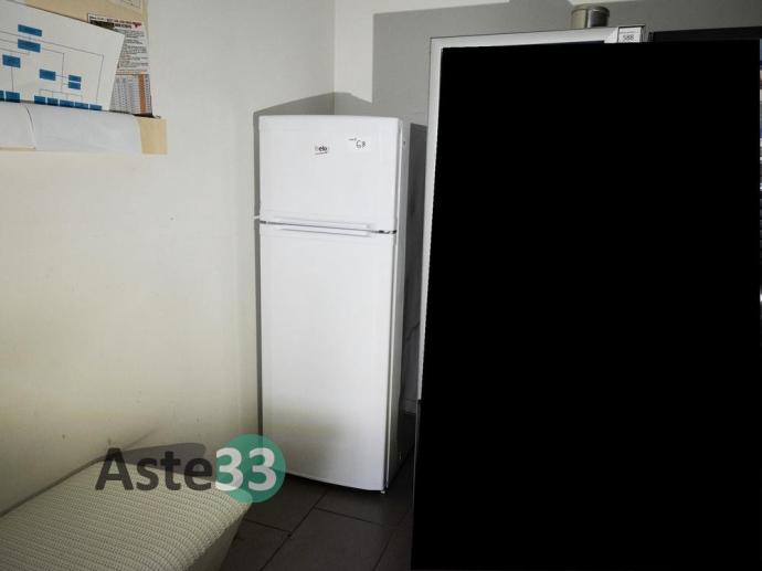 Frigorifero Beko, microonde Daewoo, macchina per caffè, specchi, sedia in vimini, divanetto intrecciato, tavolini e mobile a tre ante