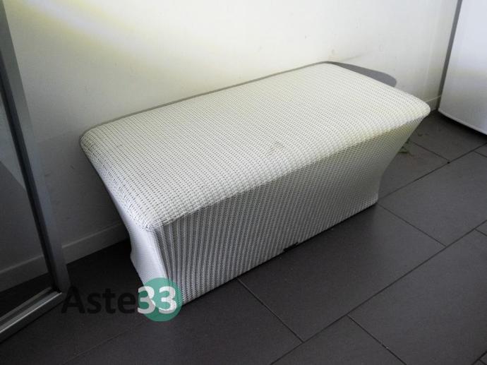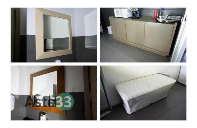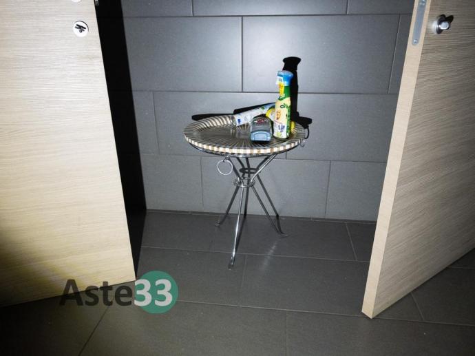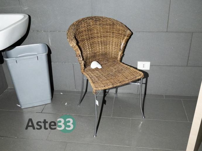 Frigorifero Beko, microonde Daewoo, macchina per caffè, specchi, sedia in vimini, divanetto intrecciato, tavolini e mobile a tre ante