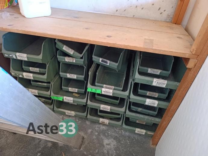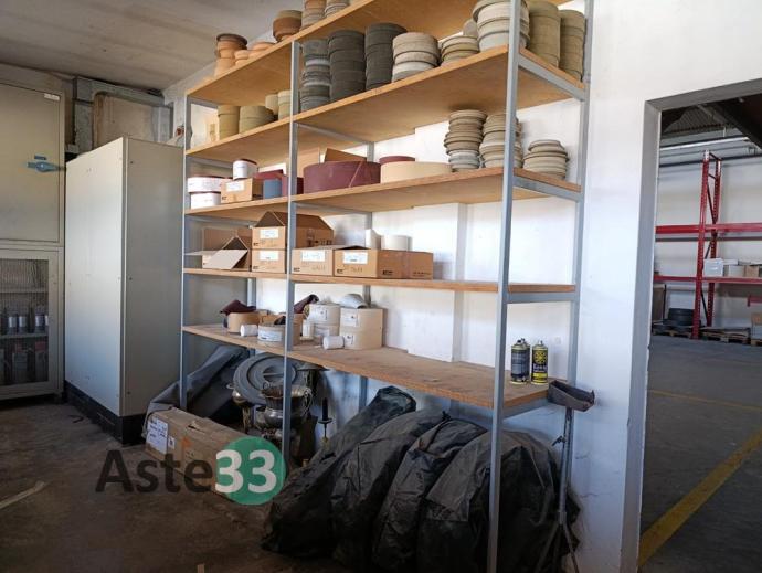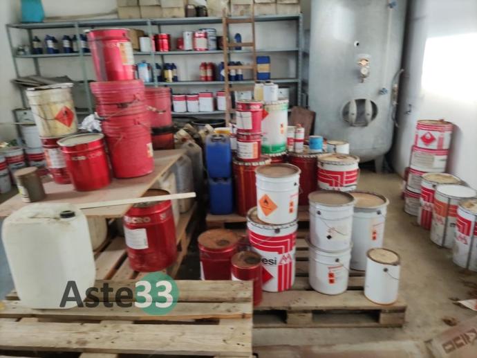 Vari bidoni per verniciatura, scaffali artigianali con ricambistica in sorte