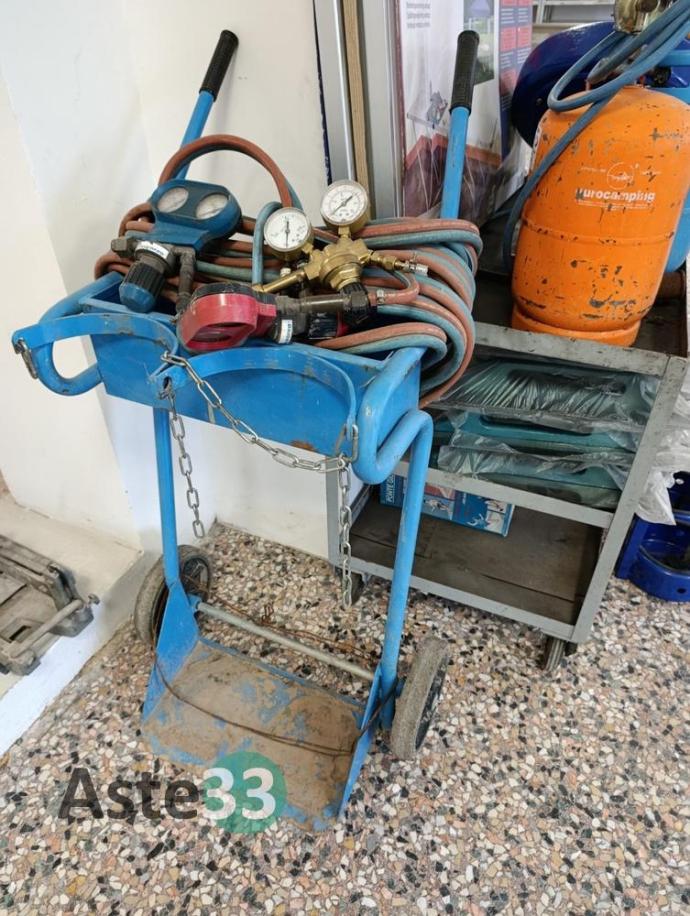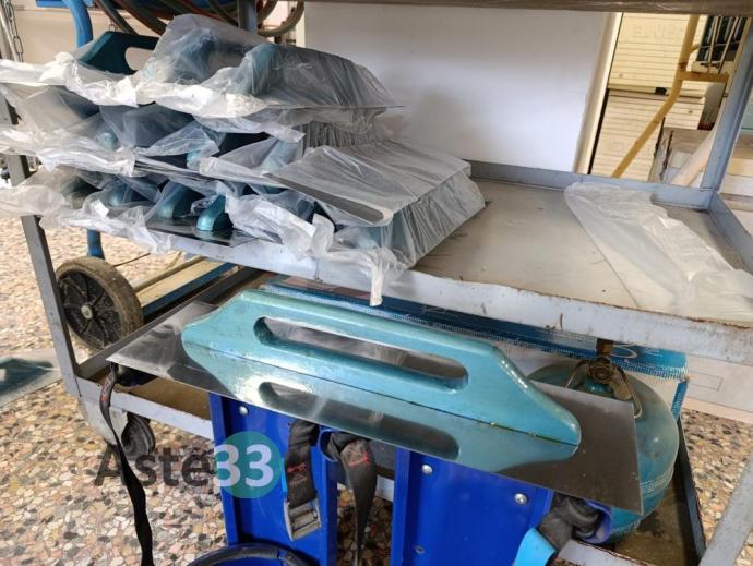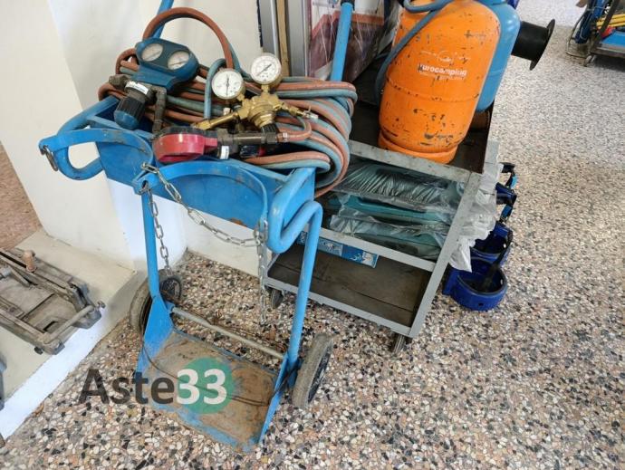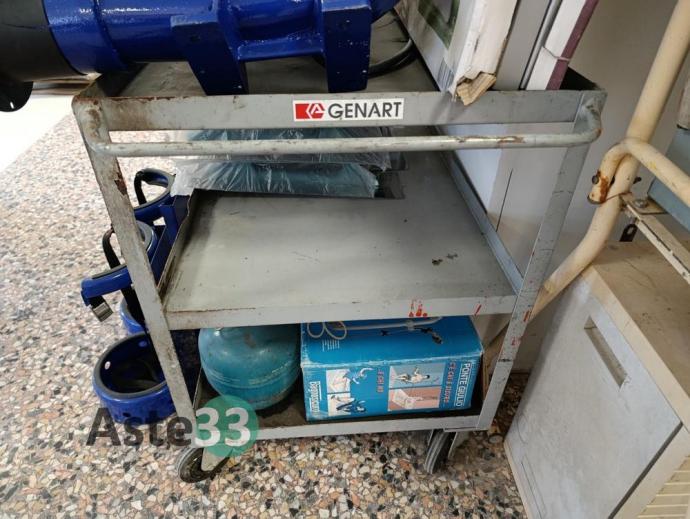 Carrello a tre ripiani, porta bombole con bombole, manometro e carrello, n. 20 frattazzi, motore per aspirazione