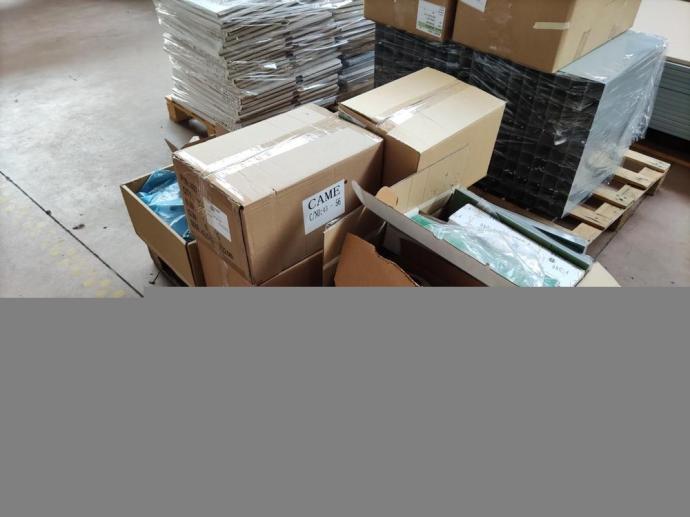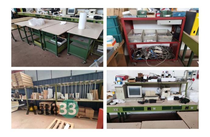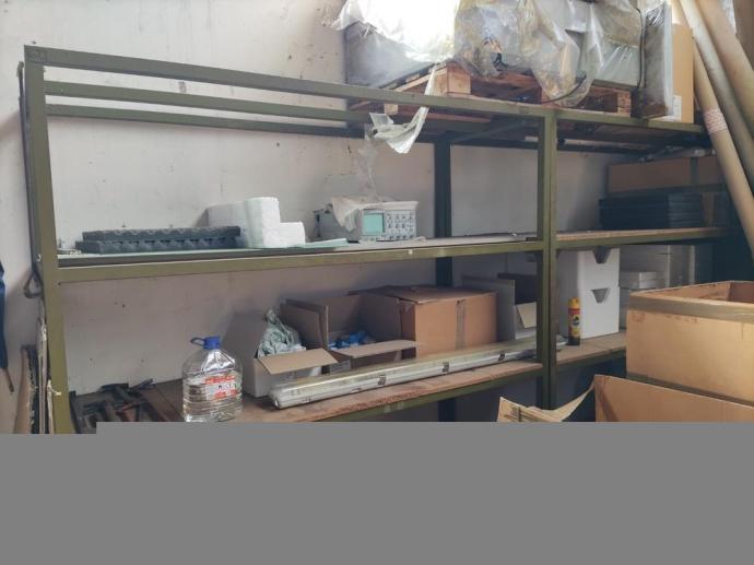 N.18 mt lineari di scaffalature, n.5 banchi da lavoro, piccole attrezzature e materiale in sorte