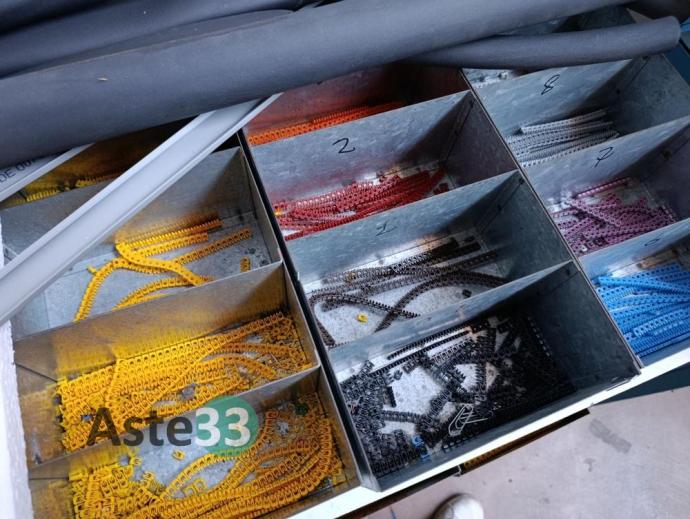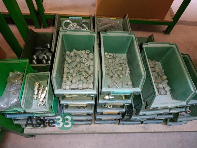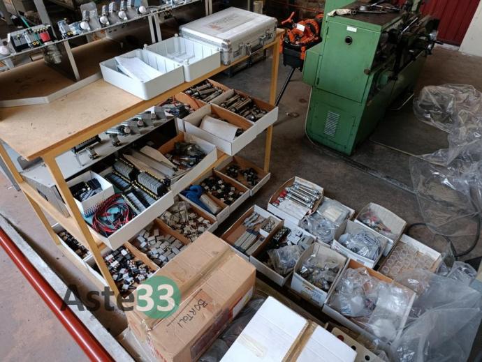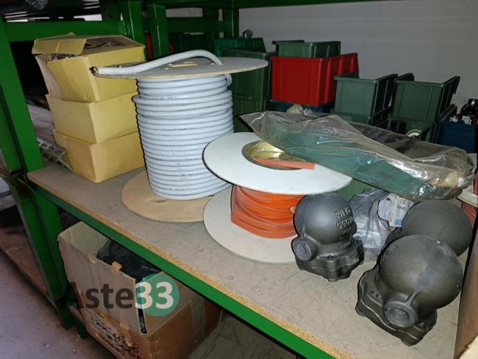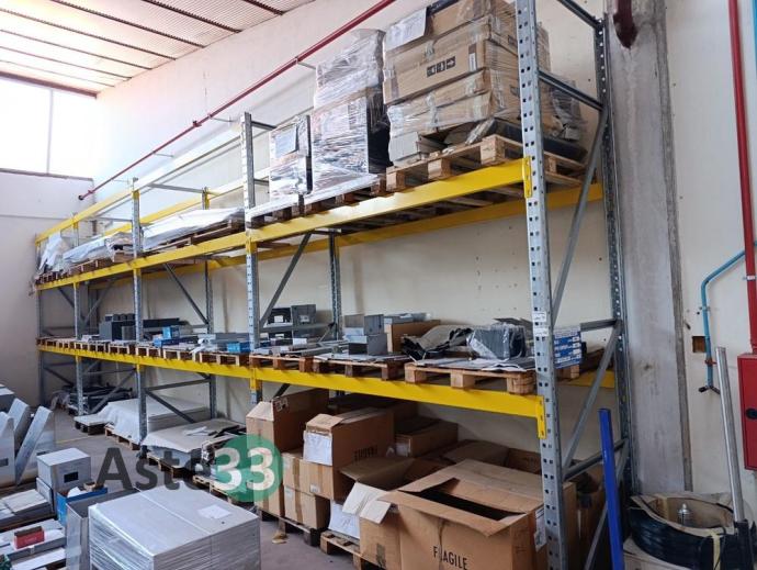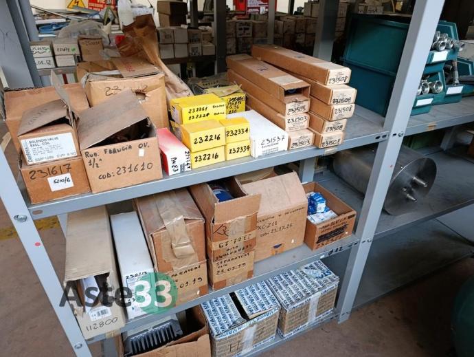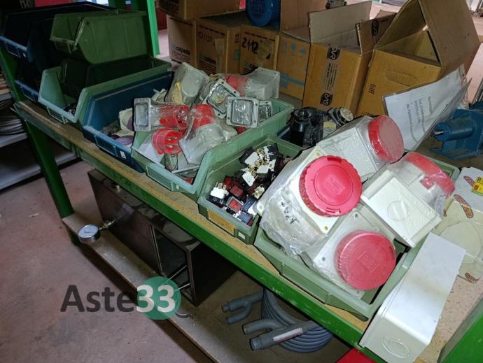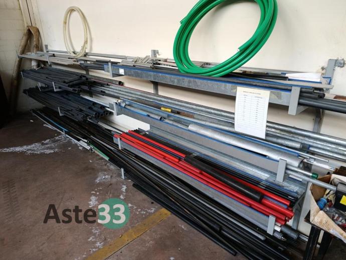 Scaffali metallici contenenti giacenze varie per impianti idraulici, elettrici, meccanici, traina filo Lincoln, n.2 rastrelliere, tavoli e carrelli