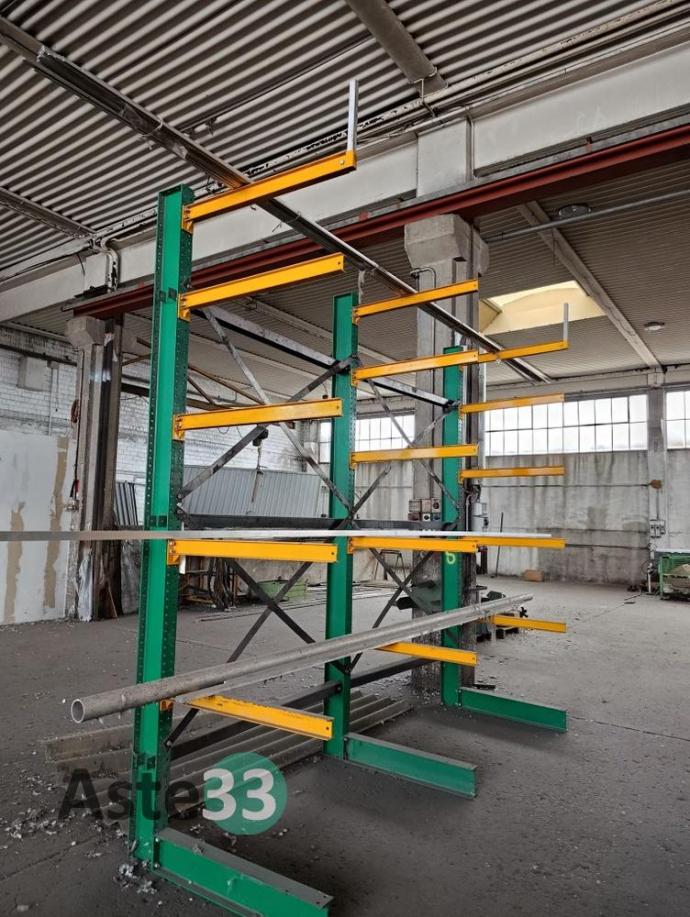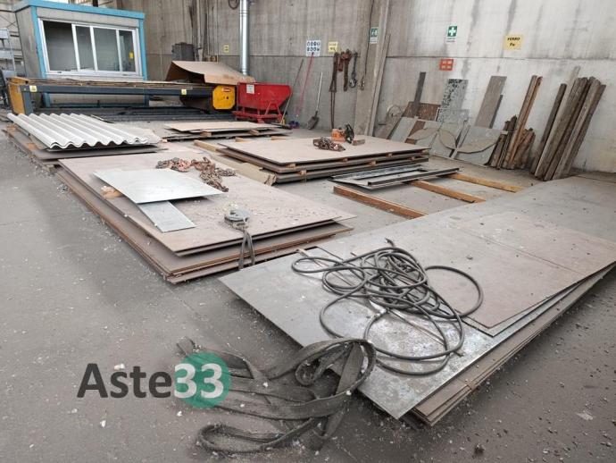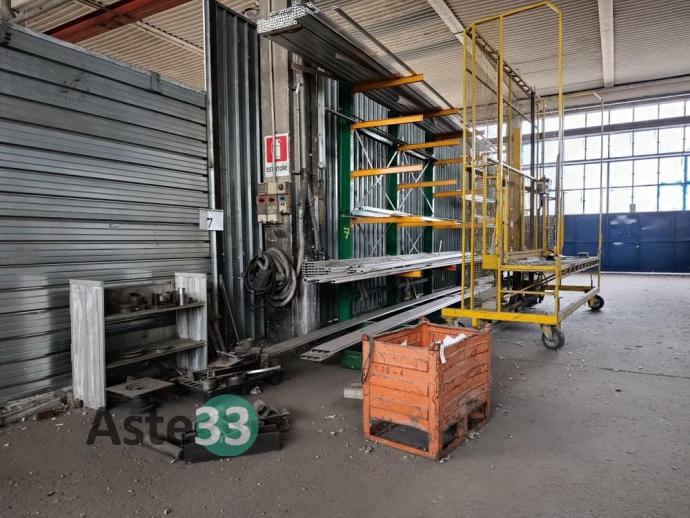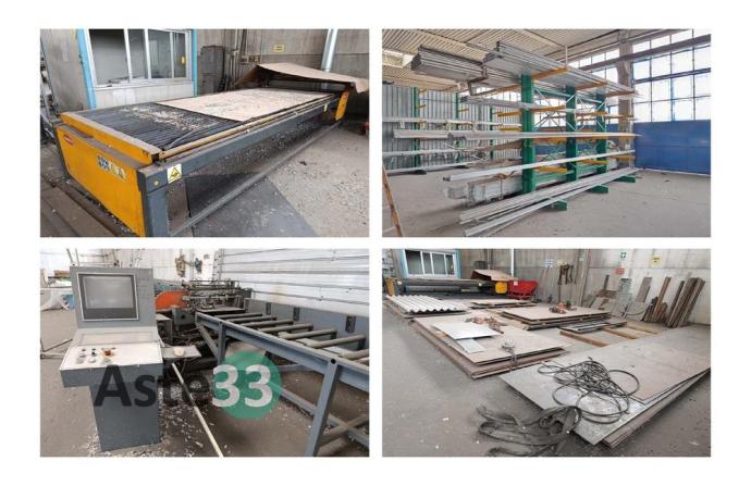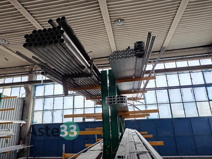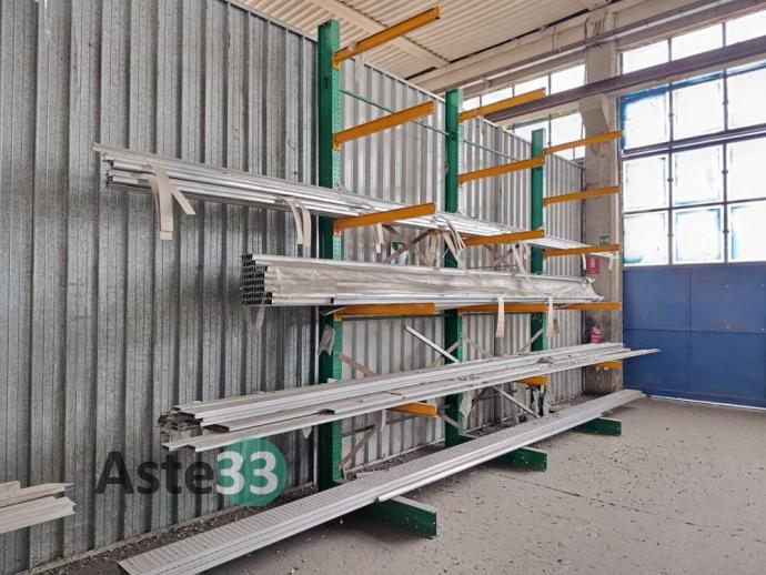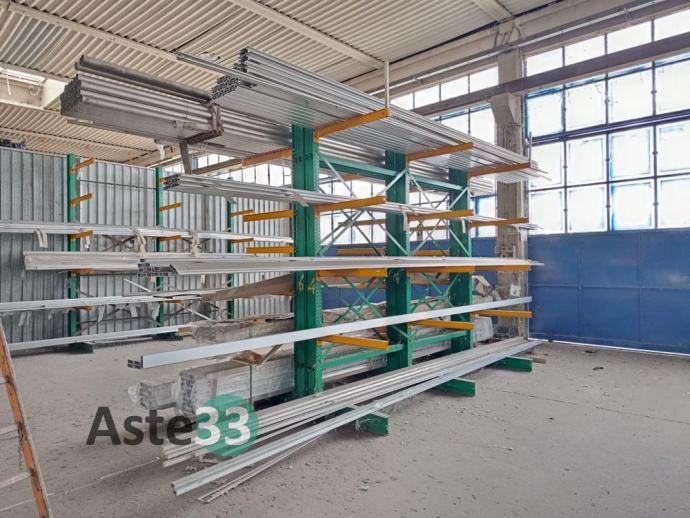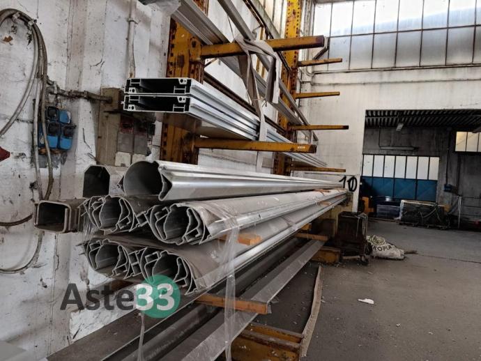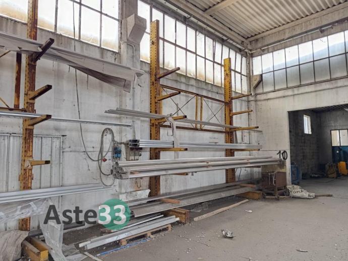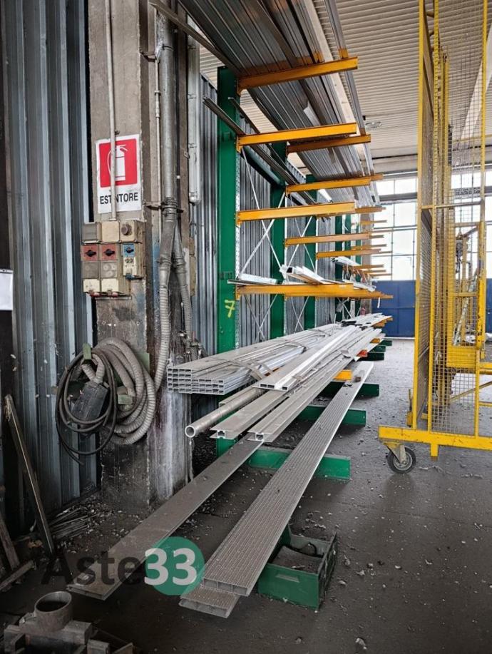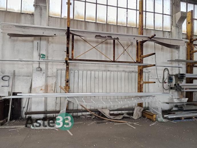 Giacenze di profilati in alluminio, lamiere metalliche, n. 7 cantilever, segatrice Tekna, taglio plasma Carbonini, trapano a colonna Serrmac ed attrezzature in sorte