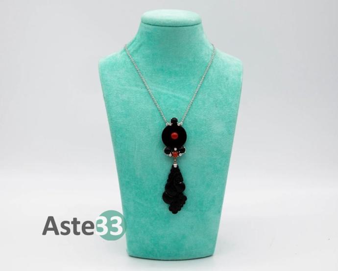 COLLANA IN ORO BIANCO CON PENDENTE IN ONICE, CORALLO E BRILLANTI.