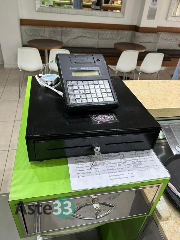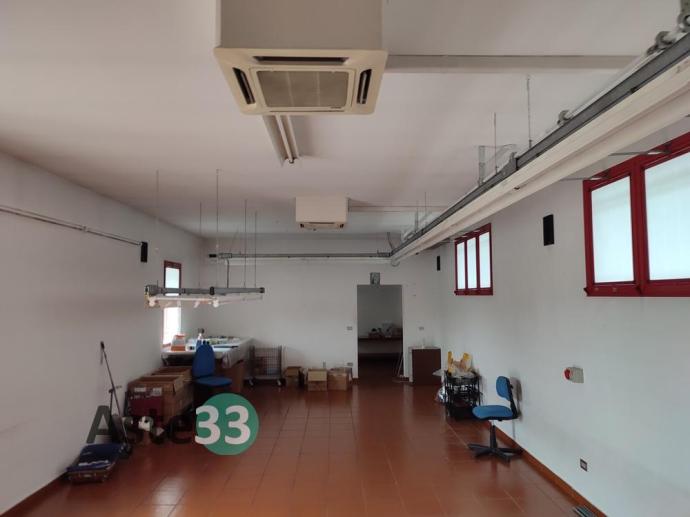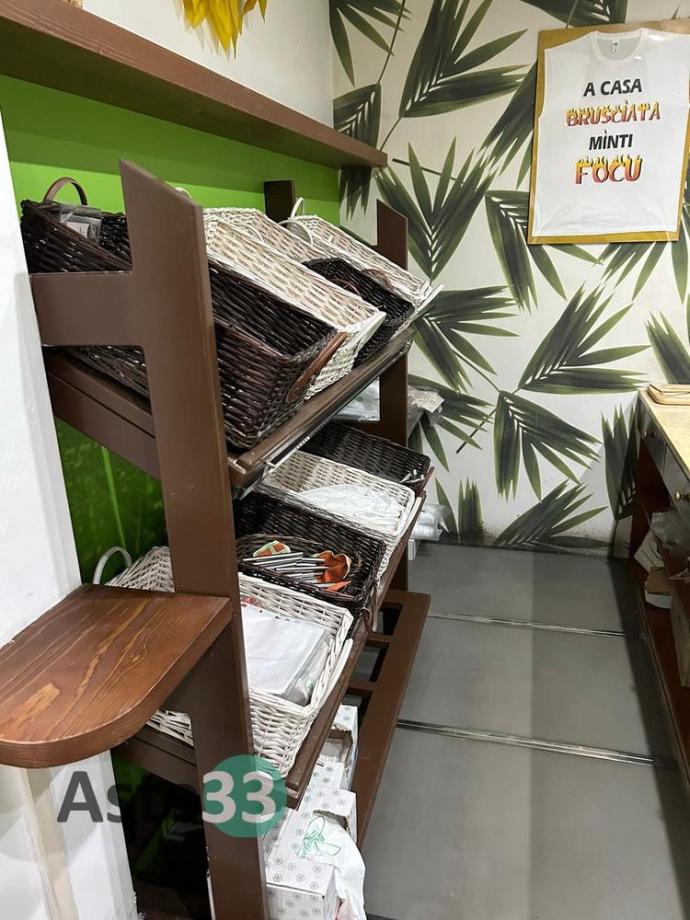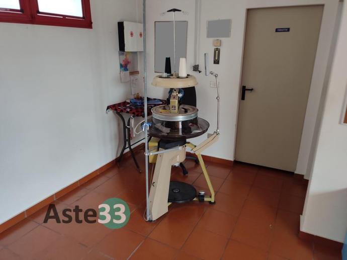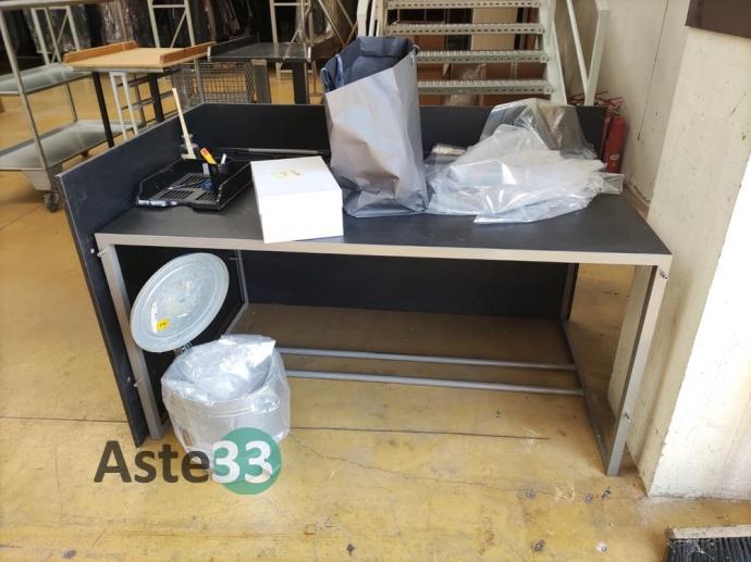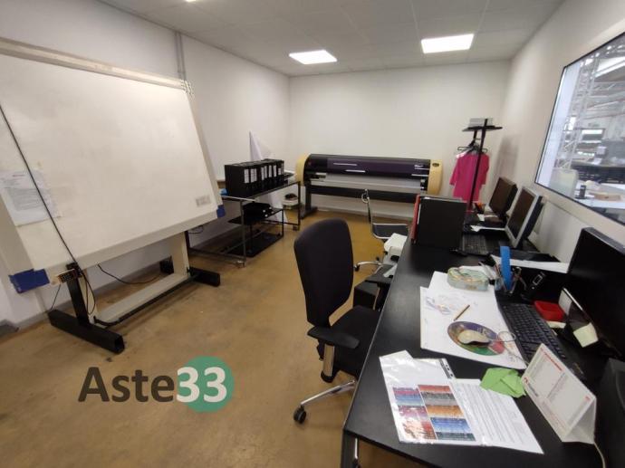 Arredamento per zona produzione, bilancia, manichini e mezzi busti, carrelli, banchi, postazione pc e bancali con imballaggi e rotoli di carta micropuntatina