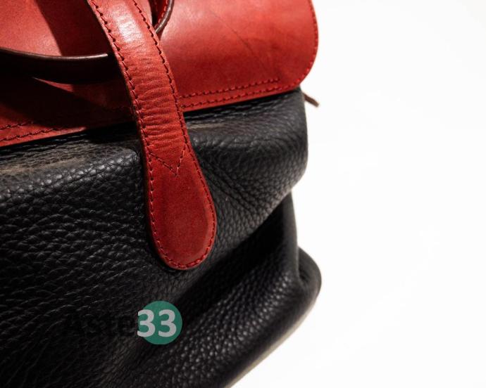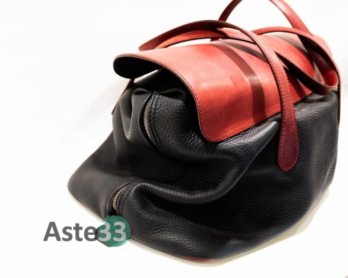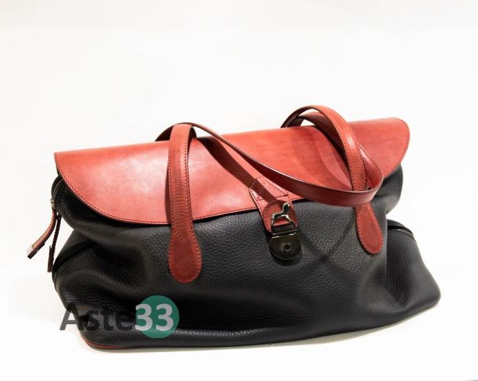 Borsone da viaggio in pelle nera e rossa, con manici, chiusura con patta e cerniera.