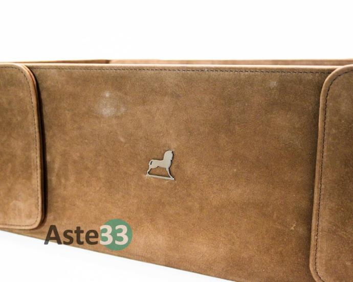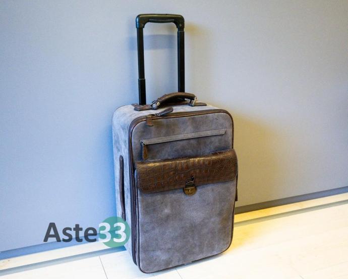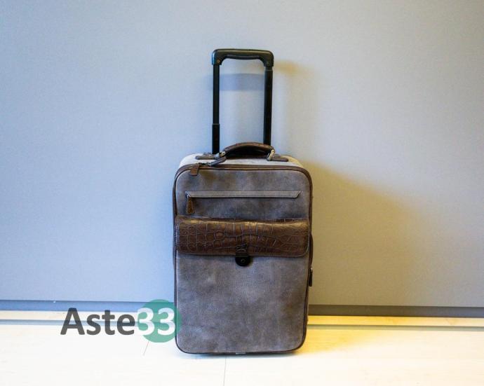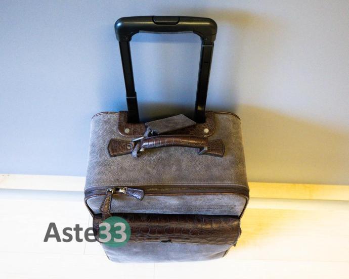 Trolley con rotelle, in pelle marrone con inserti cocco, interno in pellame rosso, misura 52x34.