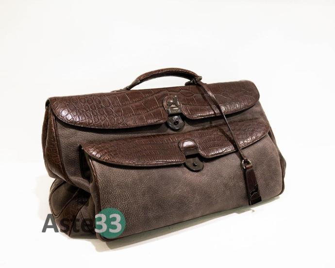 Borsone da viaggio in pelle marrone stampa cocco, doppia chiusura, interno in pelle scamosciata...