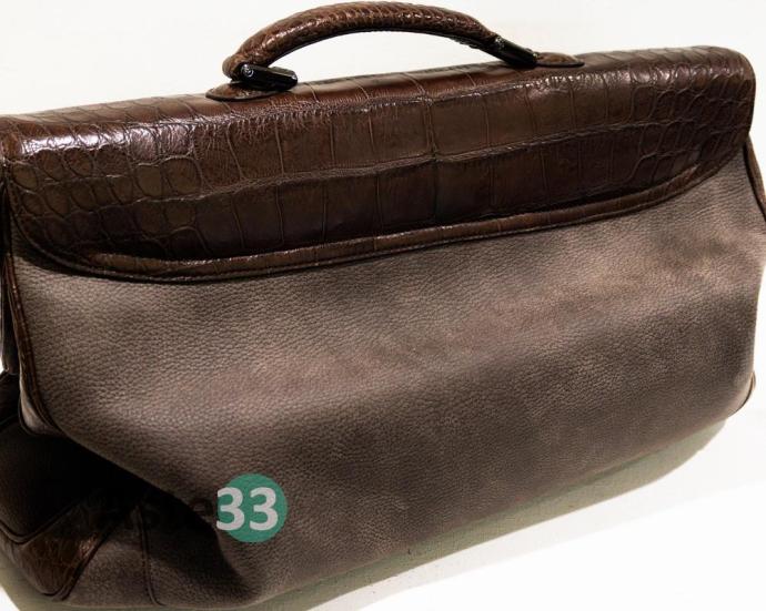 Trolley con rotelle, in pelle marrone con inserti cocco, interno in pellame rosso, misura 52x34.