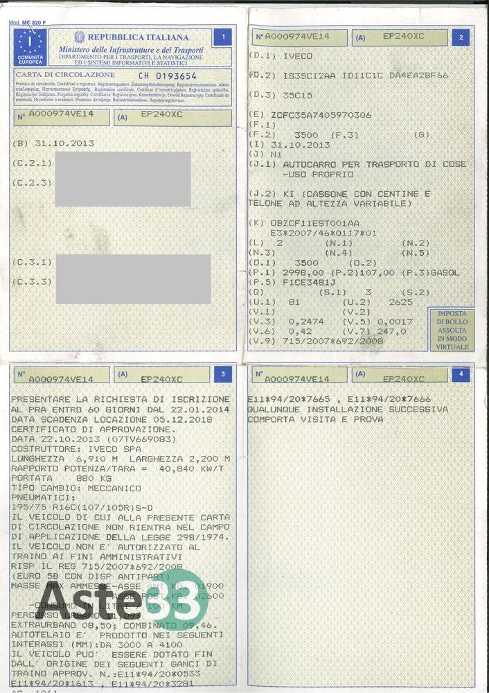 Autocarro IVECO, DAILY 35C15, carrozzeria cassone con centine e telone ad altezza variabile, targatoEP240XC, data di immatricolazione 31.10.2013, cilindrata 2998 cm³, potenza 107 kW, alimentazione a gasolio (euro 5B con disp. antipart.), portata 880 kg, lunghezza m. 6,910, larghezza 2,200 m, n. posti a sedere 3, ultima revisione regolare effettuata in data 17.10.2023 (km. rilevati in sede di...