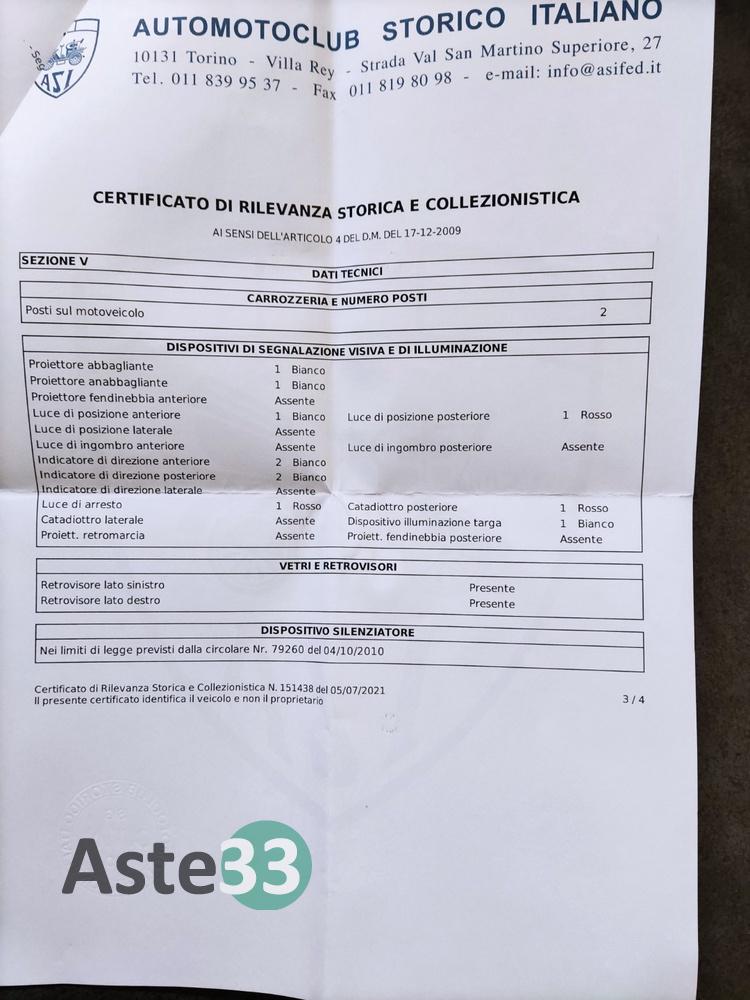 Motociclo completo di n. 1 chiave, silenziatore originale, carta di circolazione originale, certificato di proprietà originale e certificato di rilevanza storica e collezionistica iscritta al n. 151438 del registro ASI.
