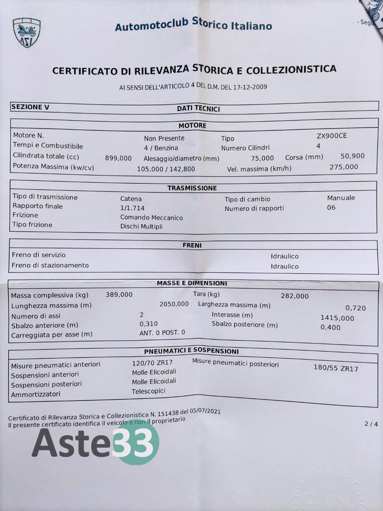Motociclo KAWASAKI HEAVY IND. LTD ZX900C, targata AA80637, data di immatricolazione 04.02.1998, cilindrata 899 cm³, potenza max kW 105, alimentazione 4 tempi benzina, ultima revisione regolare effettuata in data 22.03.2024 (km rilevati in sede di revisione 59.773).Motociclo completo di n. 1 chiave, silenziatore originale, carta di circolazione originale, certificato di proprietà originale e...