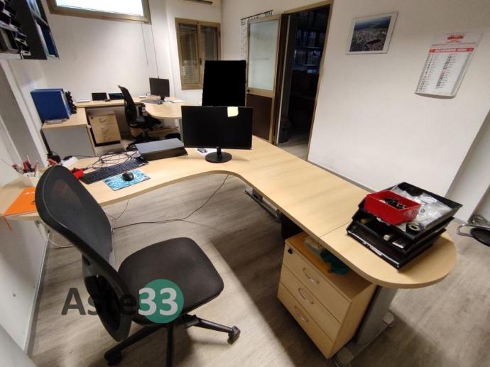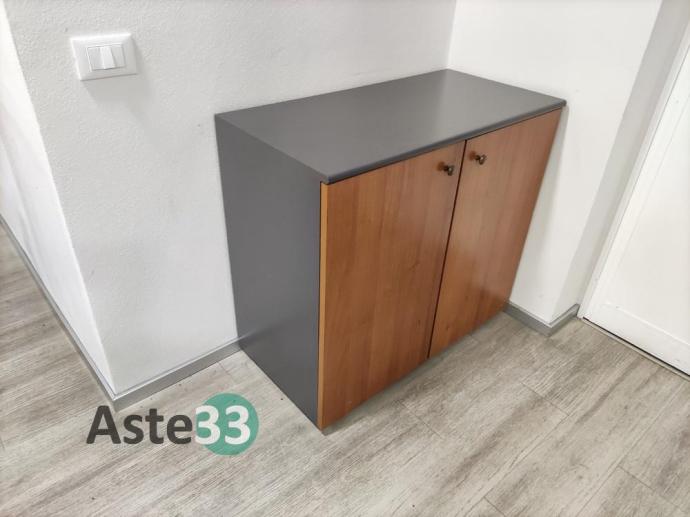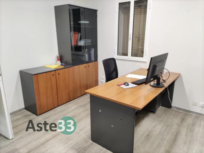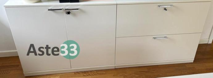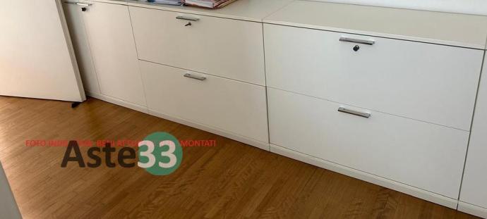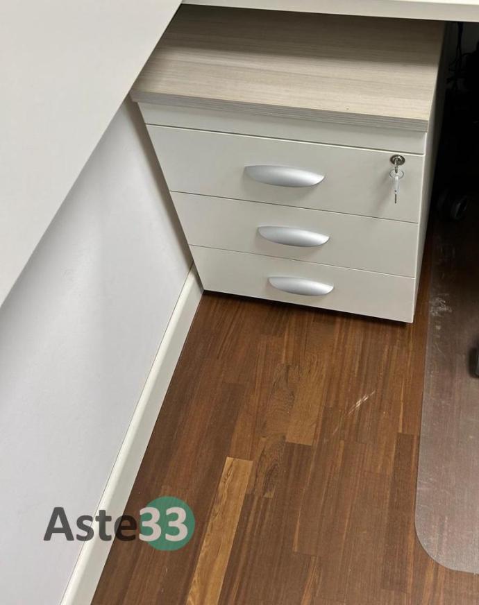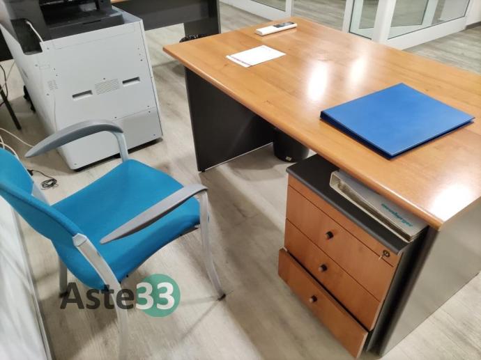 N. 3 scrivanie, armadi bassi, n. 2 armadi con ante a vetro, cassettiere e sedie