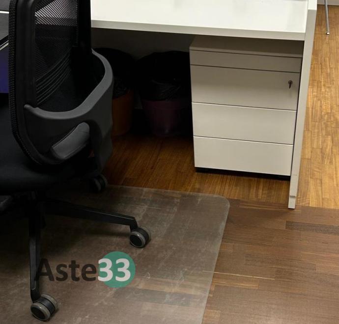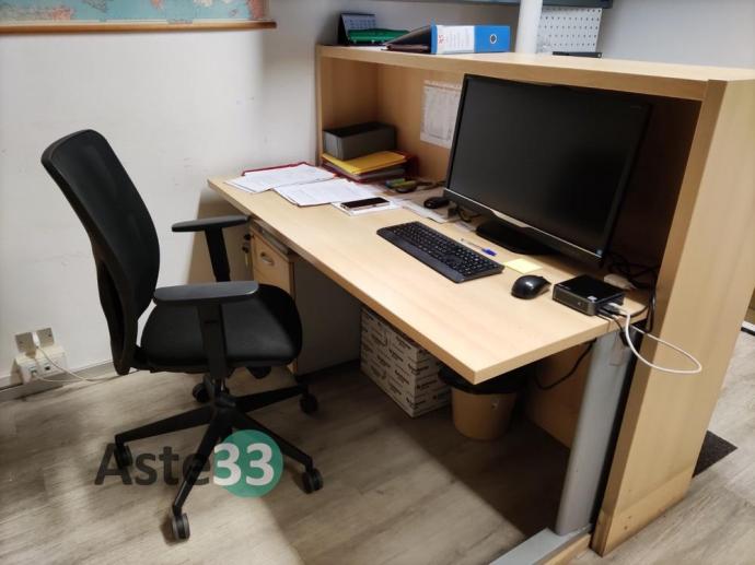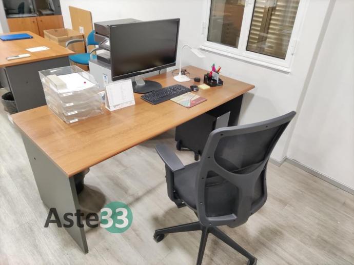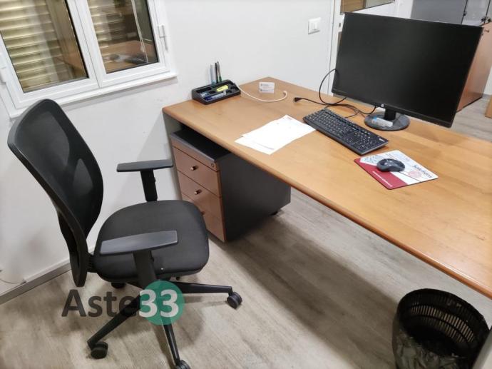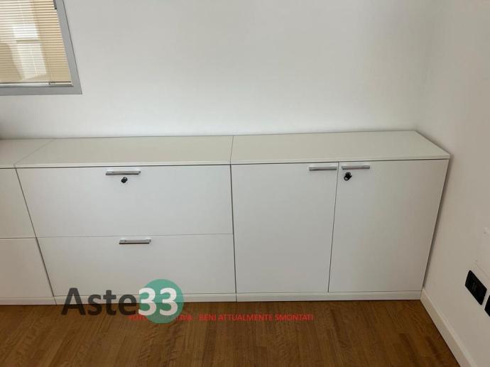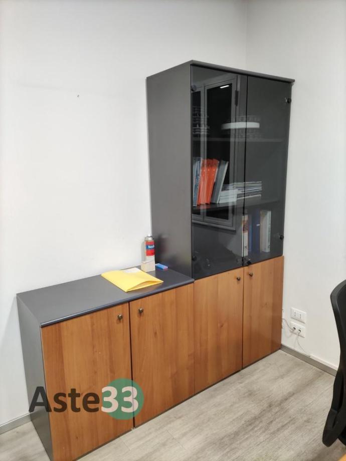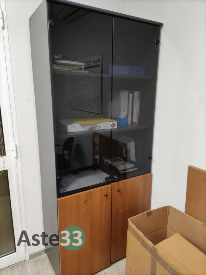 N. 3 scrivanie, armadi bassi, n. 2 armadi con ante a vetro, cassettiere e sedie