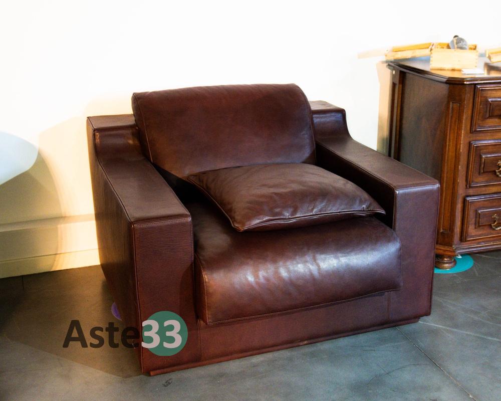 Poltrona in pellame marrone scuro con cuscinone, dimensioni di circa cm. 107x100x67 h.