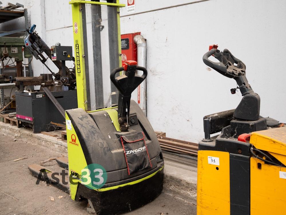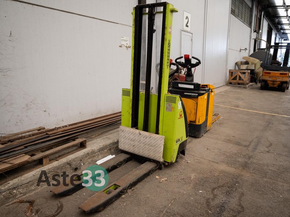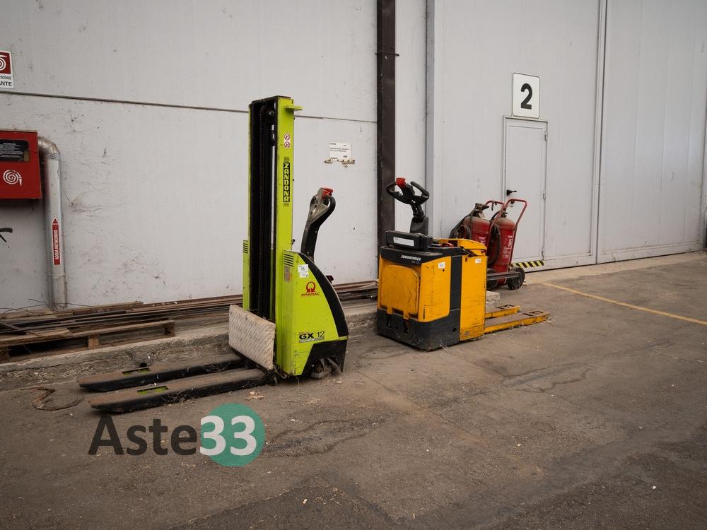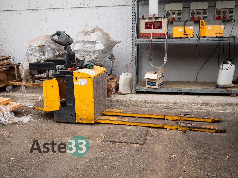 N. 2 transpallet elettrici con pedana uomo a bordo JUNGHEINRICH Mod. ERE120; N. 1 elevatore elettrico PRAMAC Mod. GX12/29 PLUS anno 2004; N. 1 transpallet manuale a forche lunghe;N. 1 carrello elevatore elettrico STILL, Mod. R60-30, matr. 516025005252, portata 30 q, anno 1998, marcato CE, (batterie da sostituire).