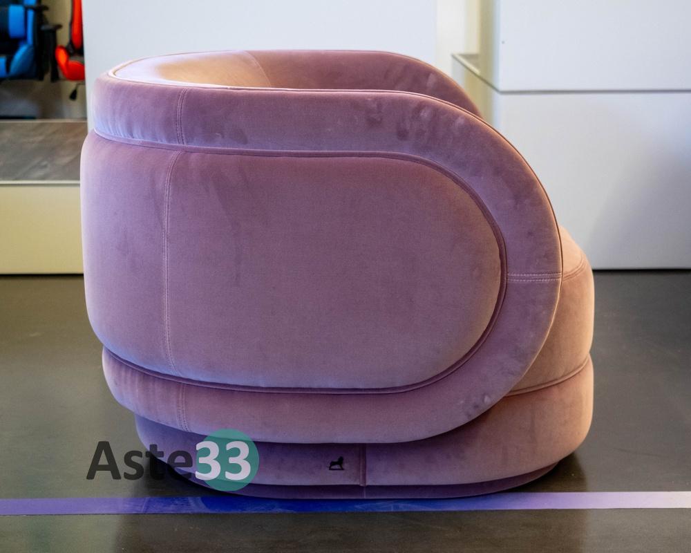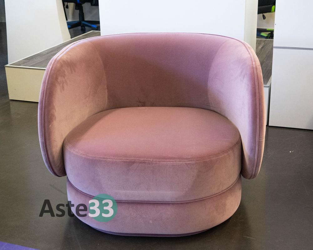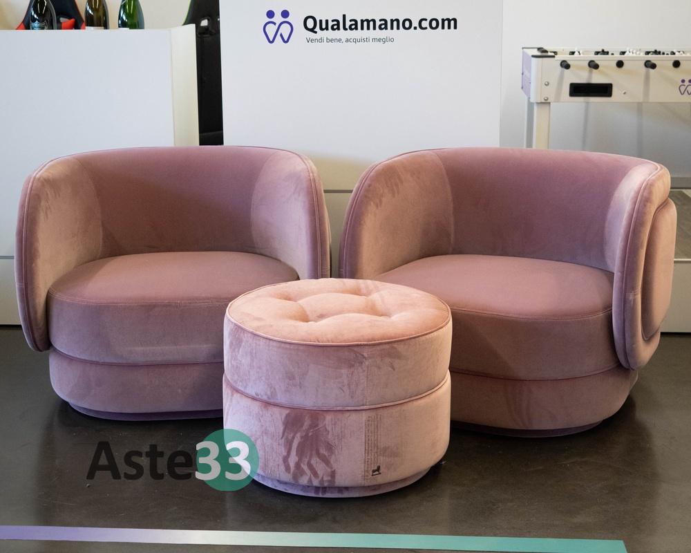 N. 2 poltrone a pozzetto modello Dyor, in velluto Pirandello rosa, dimensioni 90x90cm x altezza 72cm;N. 1 pouf modello Dyor in velluto Pirandello rosa, diametro 60cm x altezza 45cm.