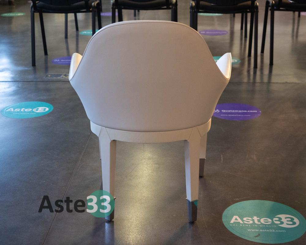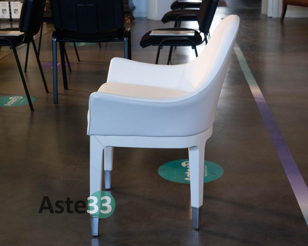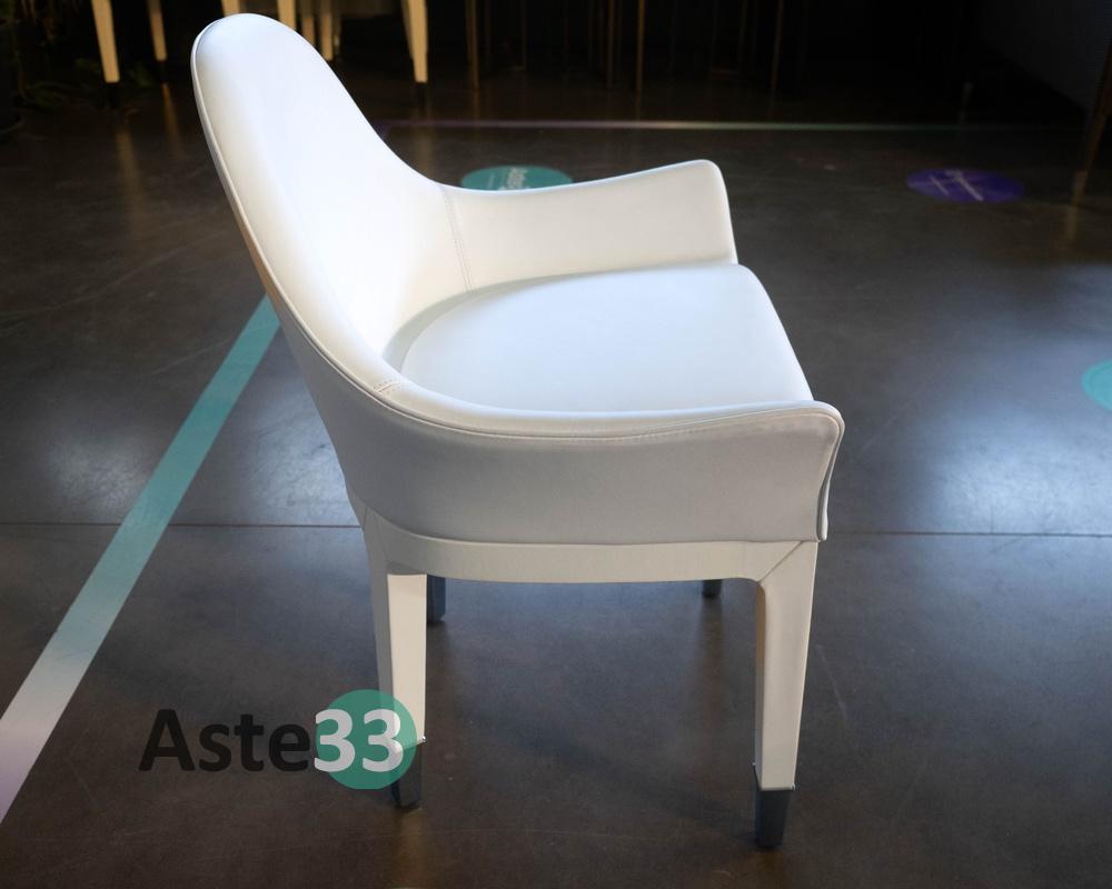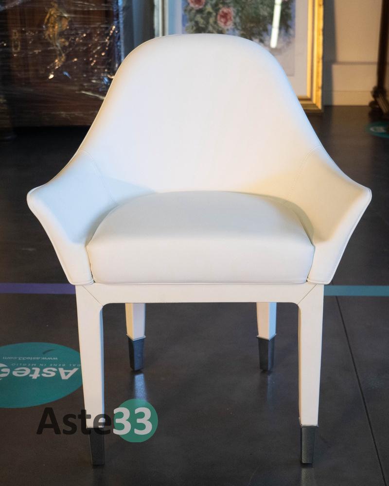 N. 4 sedie con braccioli imbottiti modello Manta, dettagli in acciaio e rivestimento in pelle bianca, dimensioni 65,5x53cm x altezza 82cm.
