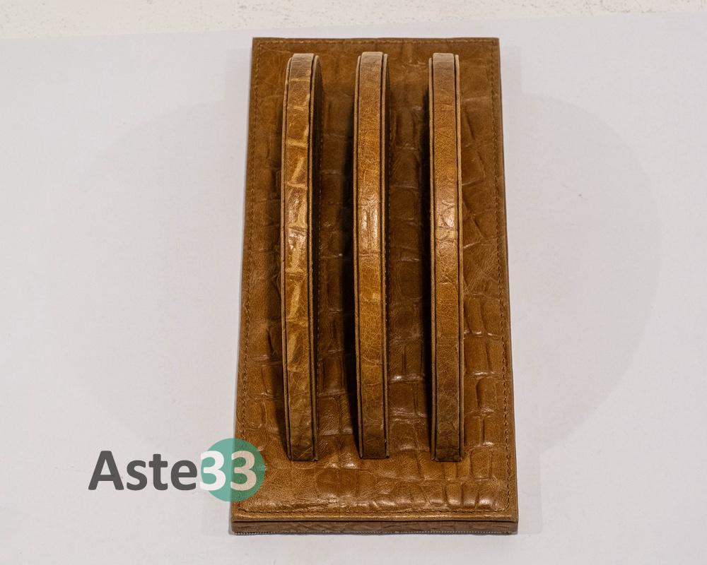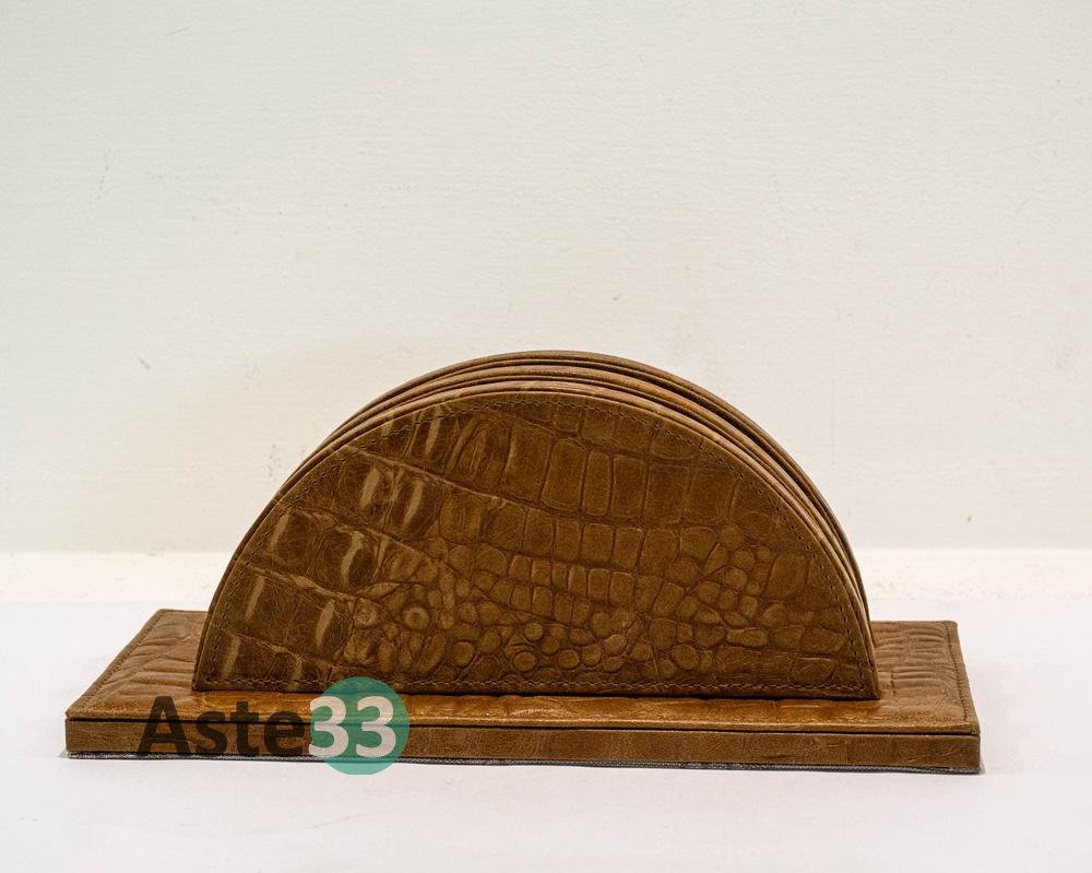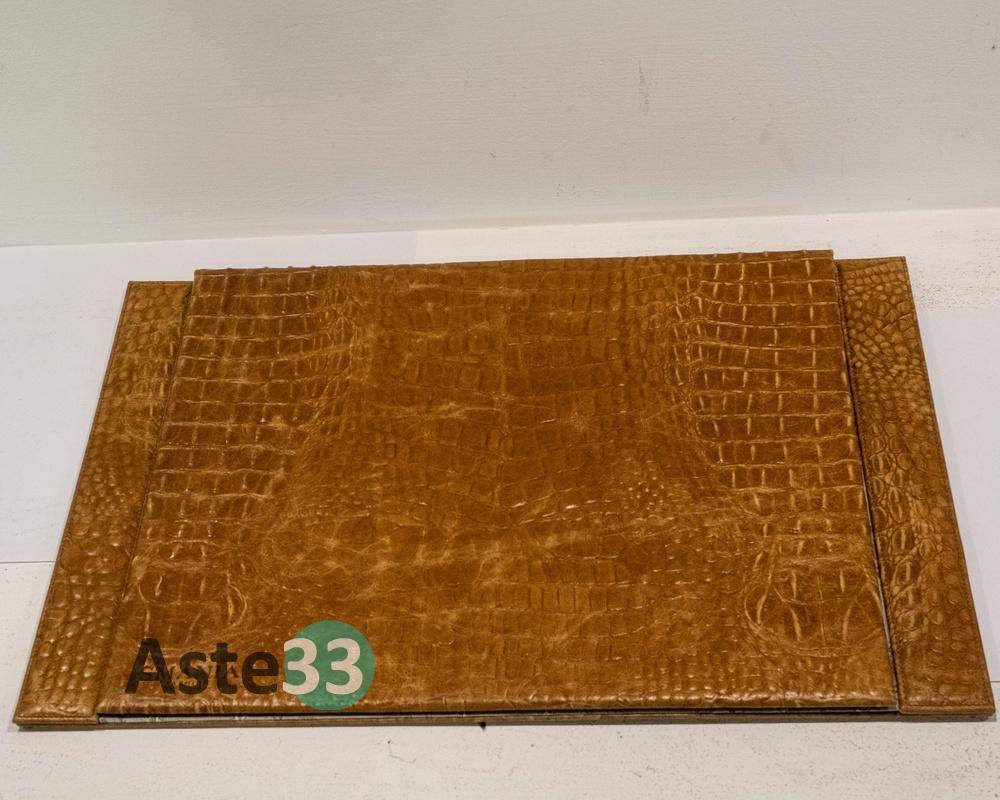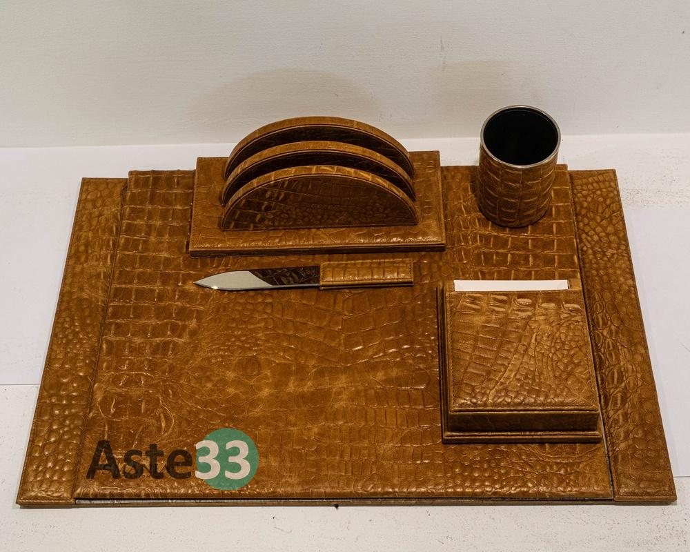 Set scrittoio composto da 5 pezzi in pelle marrone chiara stampa coccodrillo.