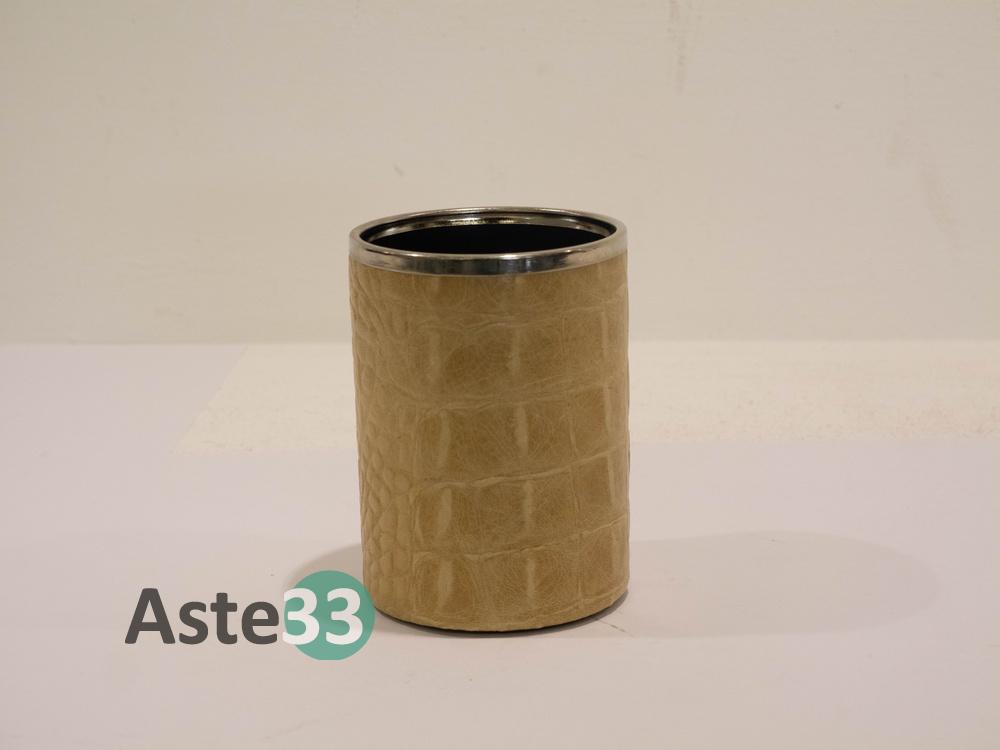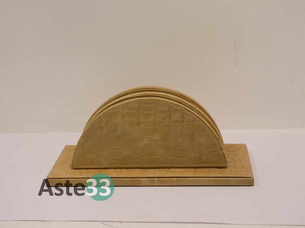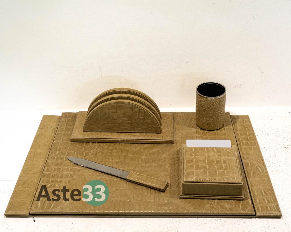 Set scrittoio composto da 5 pezzi in pelle beige stampa coccodrillo.