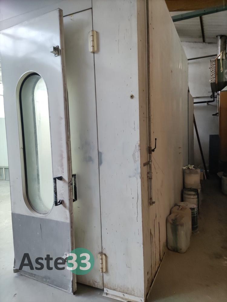 N. 1 cabina di verniciatura a secco TERMOMECCANICA F.B. provvista di forno di essiccazione, illuminazione a soffitto, aspirazione frontale, mandata a soffitto, pannellature sandwich, porta di accesso alla cabina di verniciatura, porta di accesso al forno di essiccazione, porta di comunicazione tra le due, impianto di aspirazione provvisto di bruciatore, dimensioni tot. 760x500x H= 275 cm, dimensioni cabina di verniciatura 500x380 H= 275 cm, dimensioni forno 380x400x H= 275 cm.