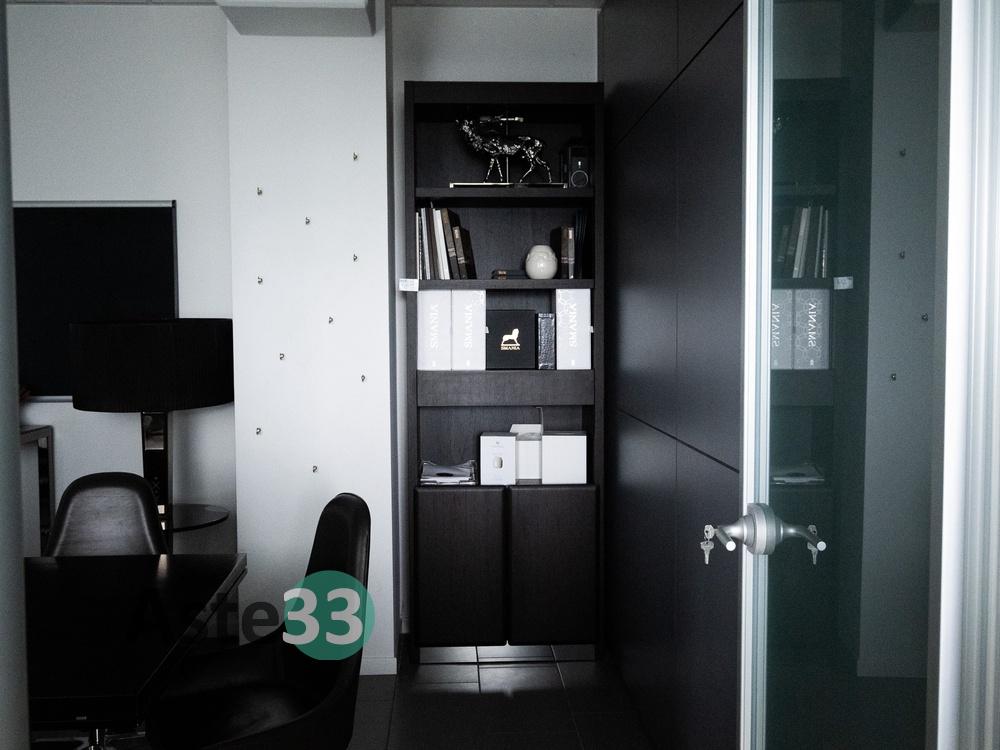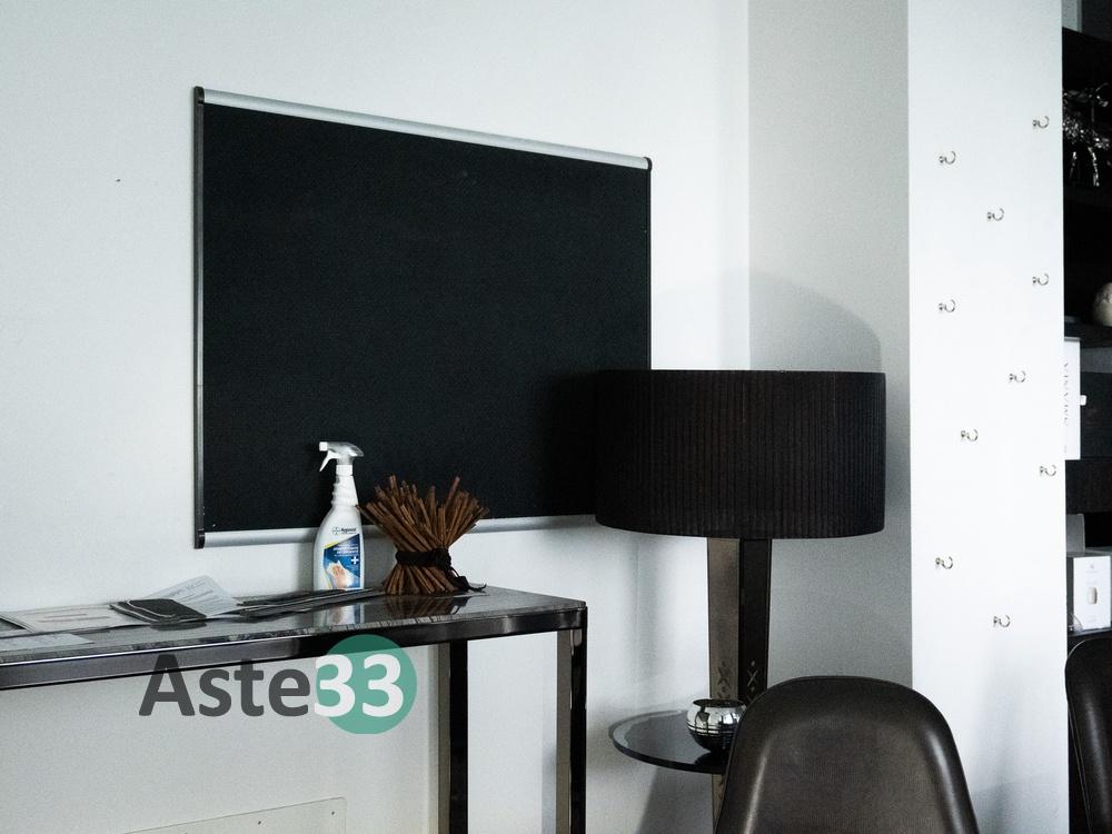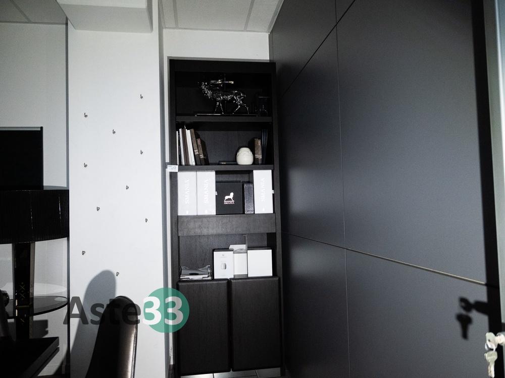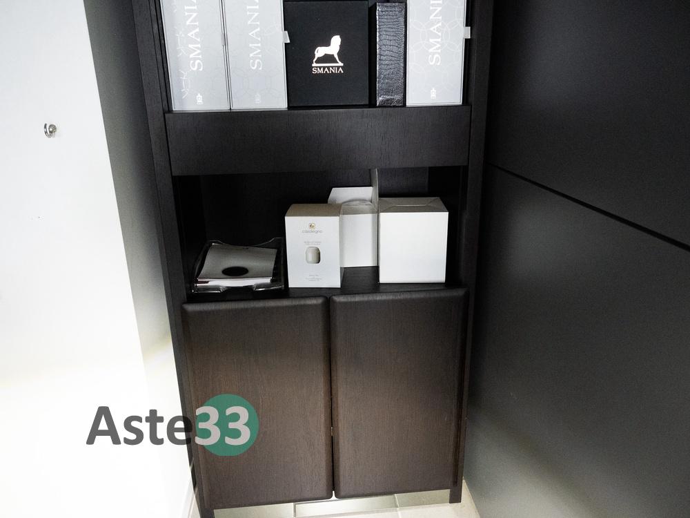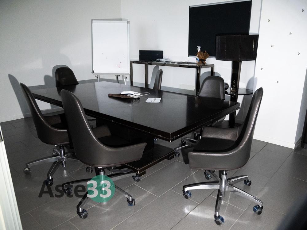 N. 1 tavolo per riunioni in tinta wengé; N. 6 poltroncine girevoli in pelle; N. 1 lavagna portafogli; N. 1 consolle con piano in marmo cromato; N. 1 lampada a piantana con tavolino;N. 1 mobile in tinta wengé a due ante e quattro vani a giorno; N. 1 cervo con lampada integrata.