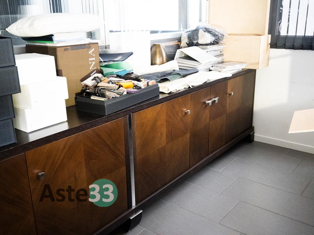N. 8 scrivanie con piano in tinta noce; N. 1 mobiletto a due vani a giorno con un'anta e un cassetto, con piano in pelle stampa coccodrillo; N. 1 mobile a otto ante; N. 1 sedia fissa rivestita in pelle stampa coccodrillo; N. 1 sedia girevole in tessuto; N. 2 sgabelli; N. 1 attaccapanni; N. 3 cassettiere di vario tipo;N. 3 lampade abatjour; N. 2 mobili a...