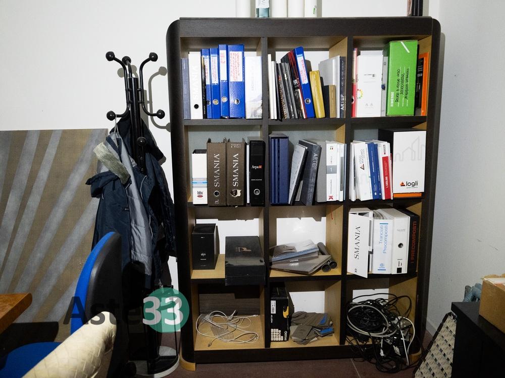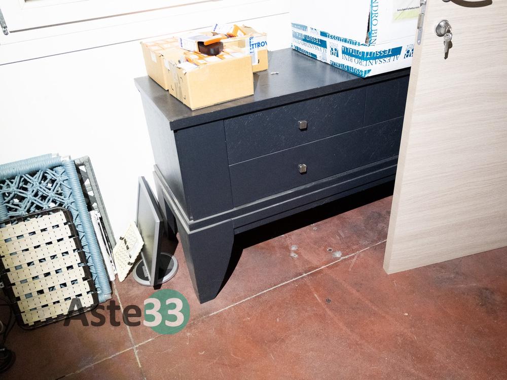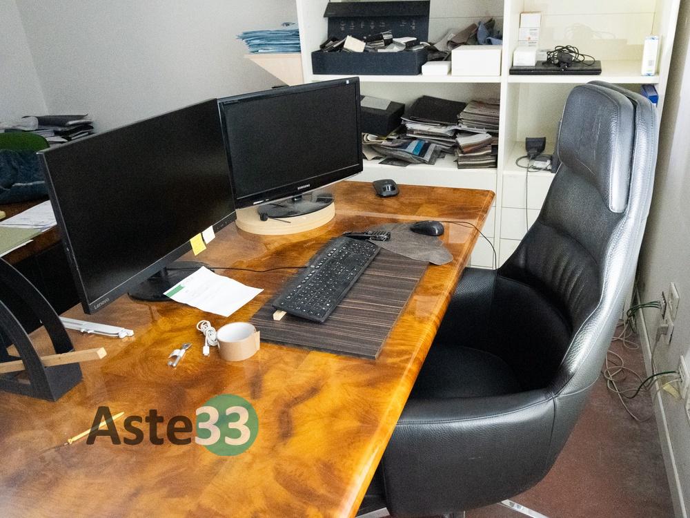 N. 4 scrivanie in tinta radica con cassettiera; N. 6 sedie girevoli; N. 2 mobiletti carrellati neri; N. 1 cassettiera nera a quattro cassetti; N. 1 mobile a otto cassetti e otto vani a giorno;N. 1 cassettiera a tre cassetti; N. 1 attaccapanni; N. 1 mobile a dodici vani a giorno; N. 1 cassettiera;N. 1 sedia girevole; N. 1 scrivania in laminato...