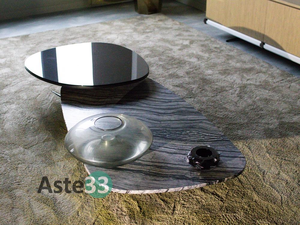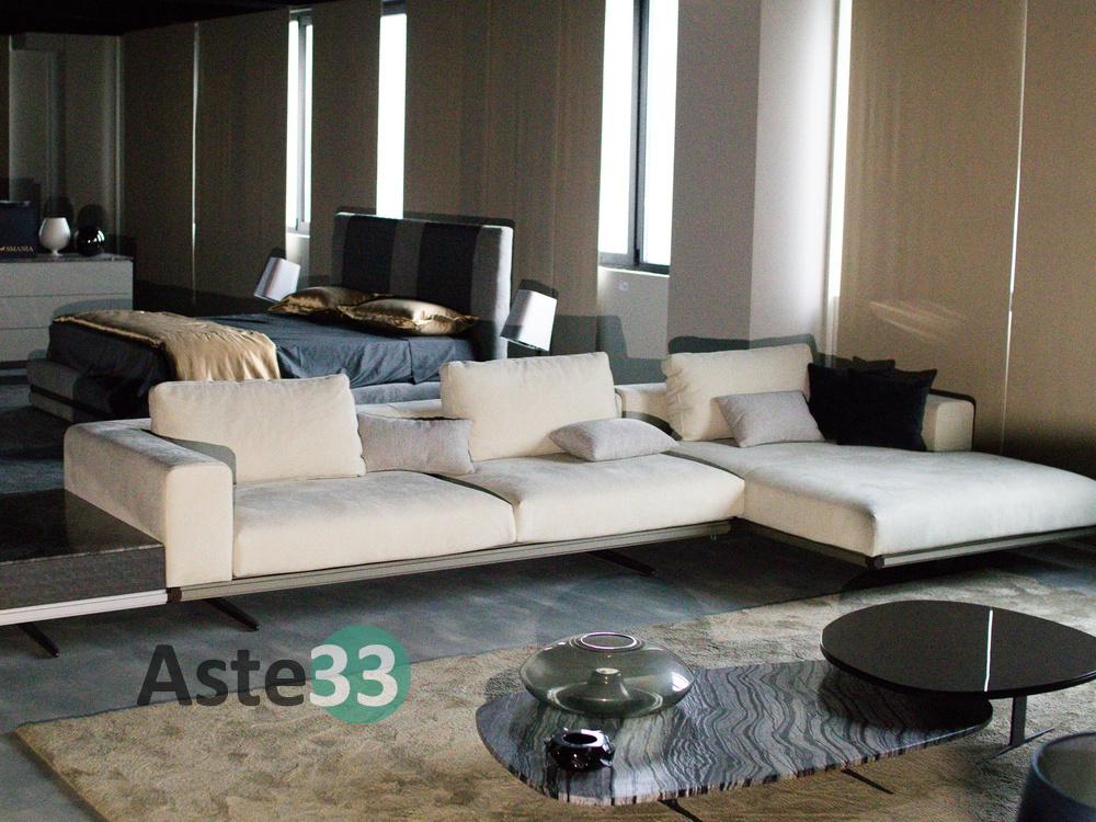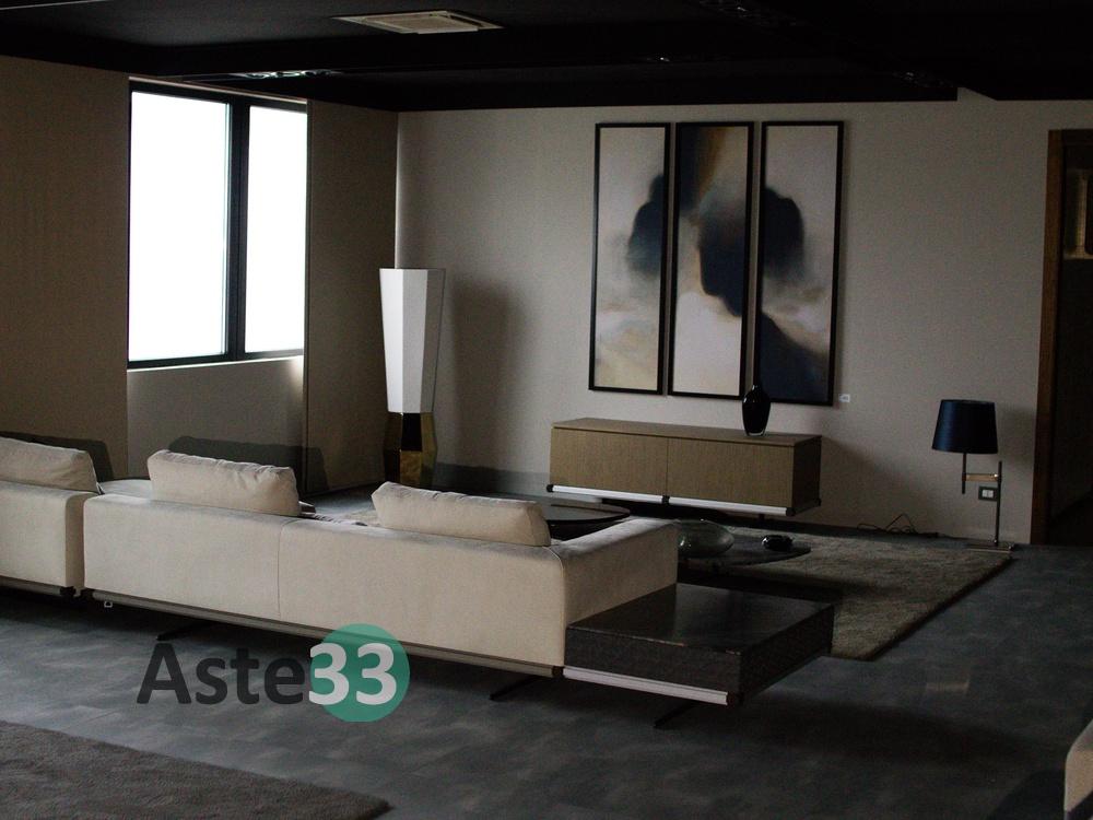 N. 1 tappeto in tessuto dim. 3x5 metri; N. 3 quadri; N. 1 lampada abatjour; N. 1 vaso in vetro; N. 1 mobile con due cassettoni e struttura in alluminio; N. 1 divano a tre posti con sceslong e tavolino con piano in marmo; Cuscini vari; N. 1 tavolo a due livelli; N. 1 vaso; N. 1 posacenere; N. 1 elemento ornamentale tinta avorio/dorato.