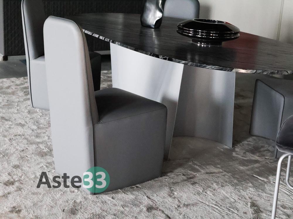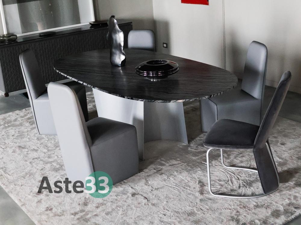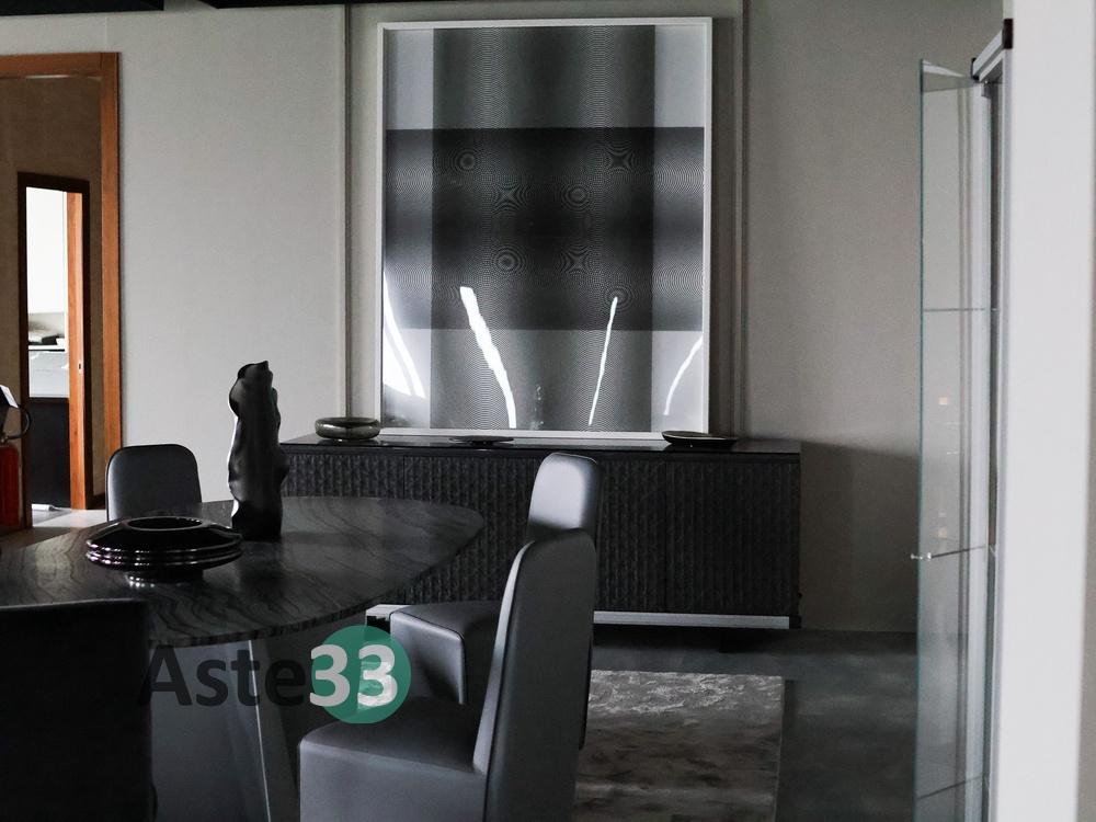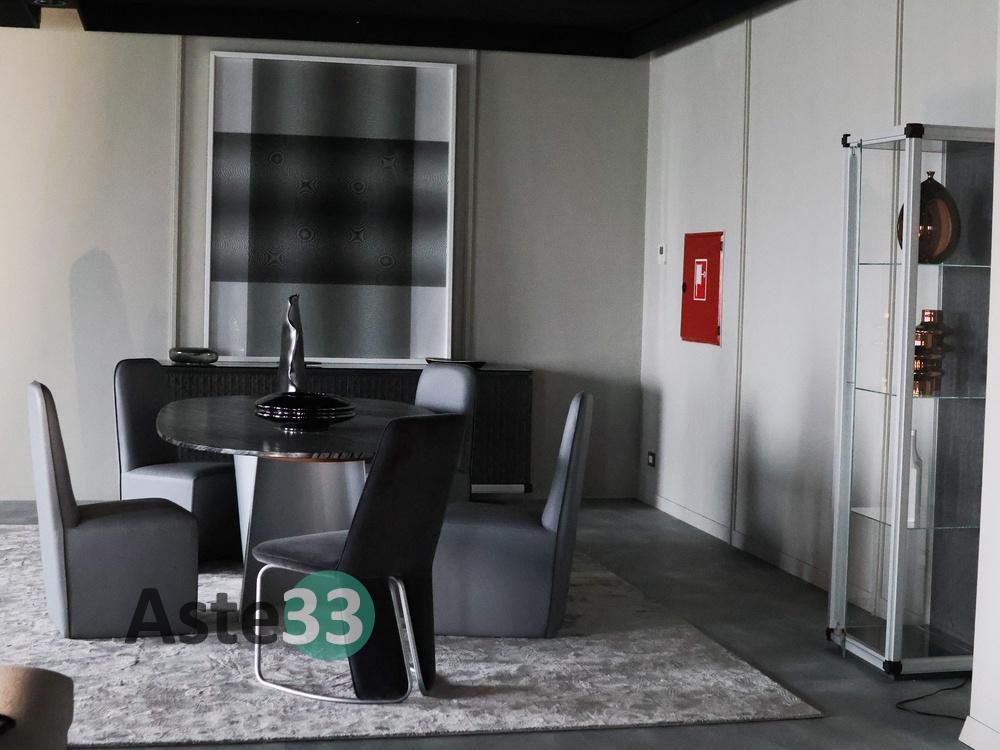 N. 1 tavolo con piano ovale in marmo; N. 4 sedie rivestite in pelle grigia; N. 1 vetrinetta con struttura in alluminio; N. 1 tappeto in tessuto dim. 400x300 cm; N. 1 sedia in velluto grigio; N. 1 mobile a quattro ante con finiture in pelle; N. 1 quadro moderno; N.10 elementi di decoro di vario tipo.