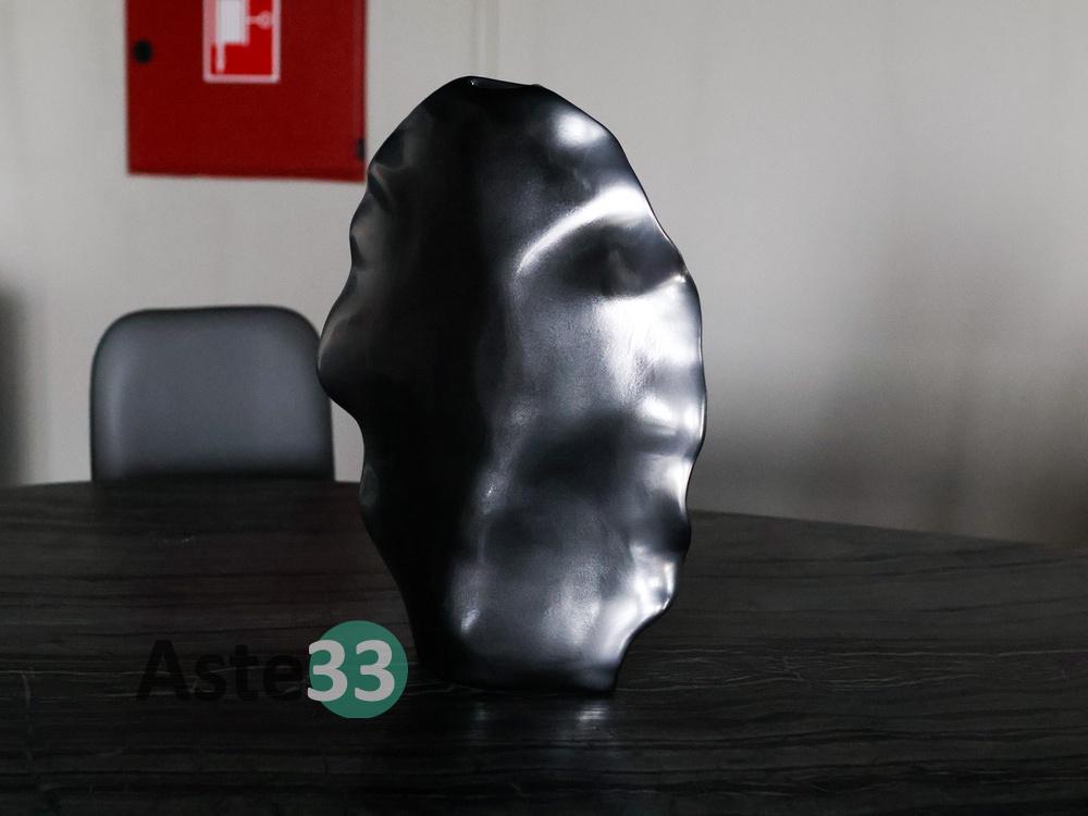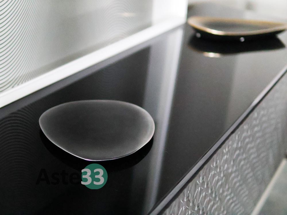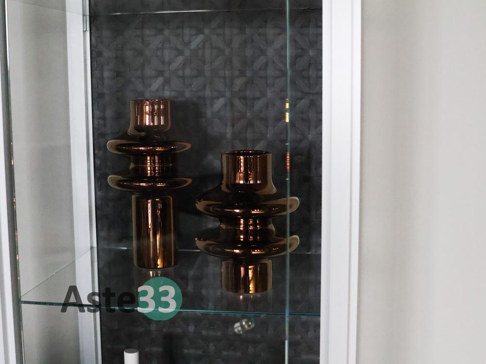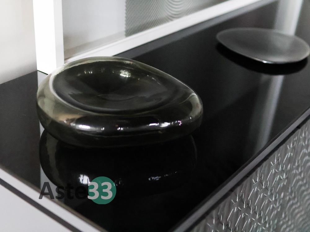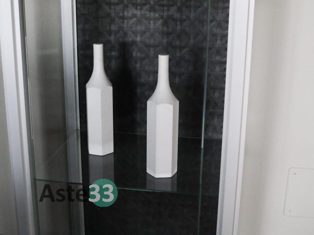N. 1 tavolo con piano ovale in marmo; N. 4 sedie rivestite in pelle grigia; N. 1 vetrinetta con struttura in alluminio; N. 1 tappeto in tessuto dim. 400x300 cm; N. 1 sedia in velluto grigio; N. 1 mobile a quattro ante con finiture in pelle; N. 1 quadro moderno; N.10 elementi di decoro di vario tipo.