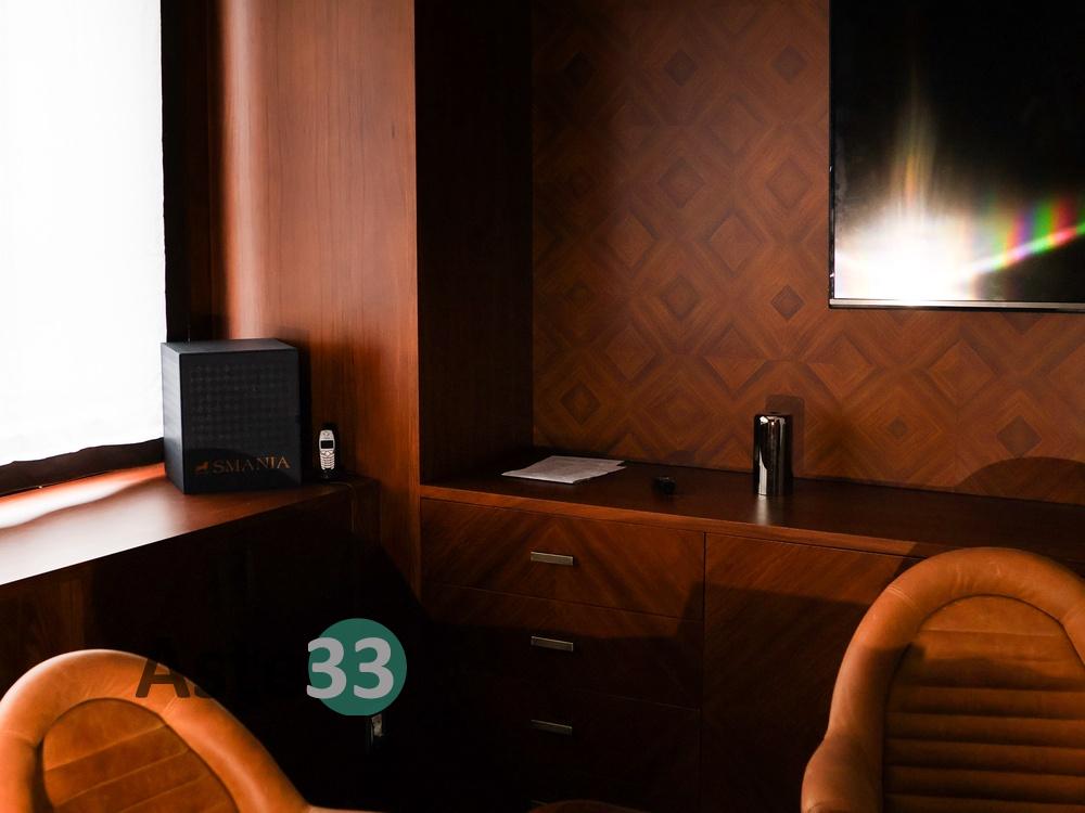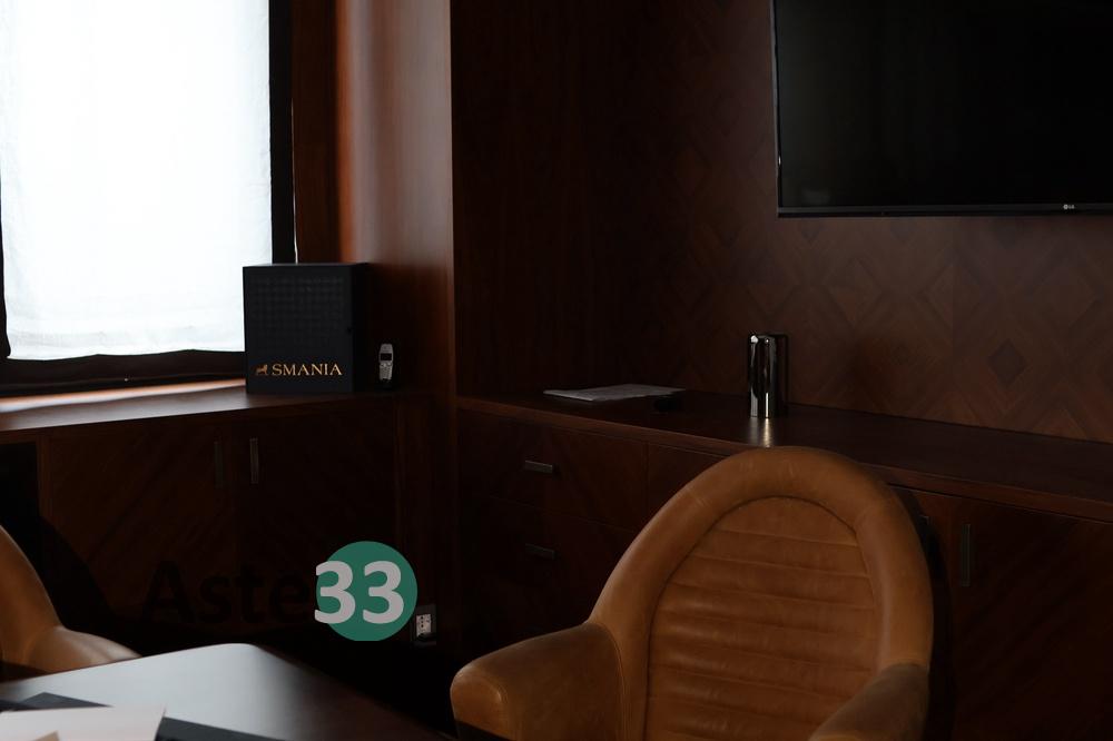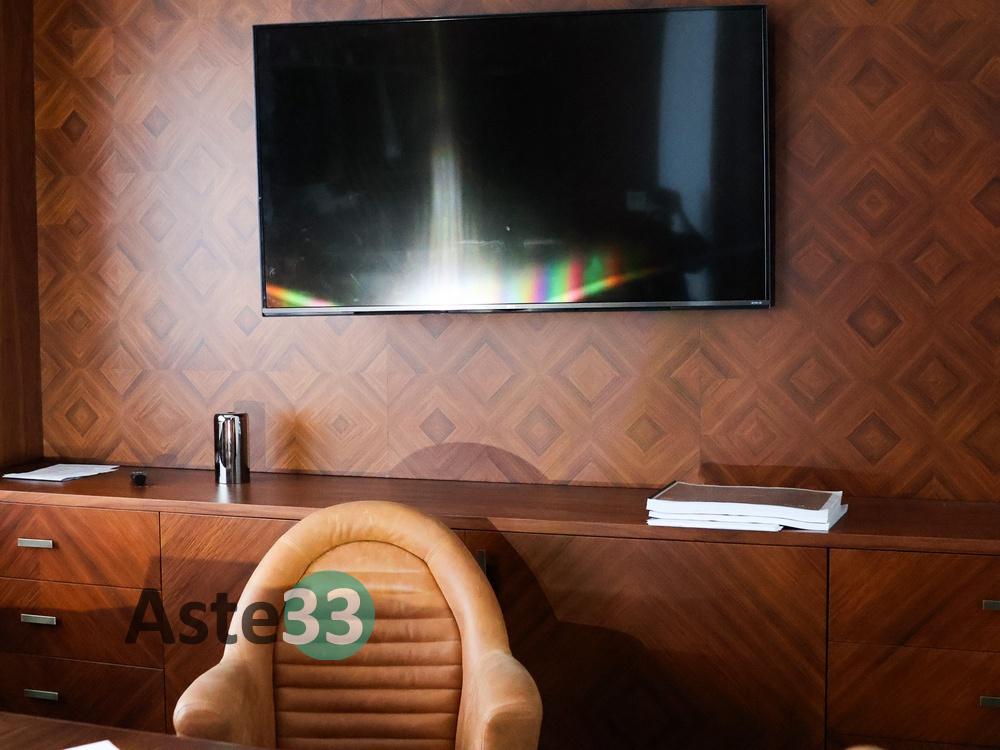 N. 1 televisore LG da 60", Mod. 60UF776V-ZQ;N. 1 tavolo per riunioni in tinta noce; N. 6 poltroncine girevoli in pelle tinta nocciola; N. 1 poltroncina girevole direzionale in tinta nocciola; N. 1 boiserie con due ante e otto cassetti e parete porta TV, dim. 410xH= 348 cm; N. 1 mobile basso a sei ante e otto vani a giorno; N. 1 boiserie con portale con due ante in...