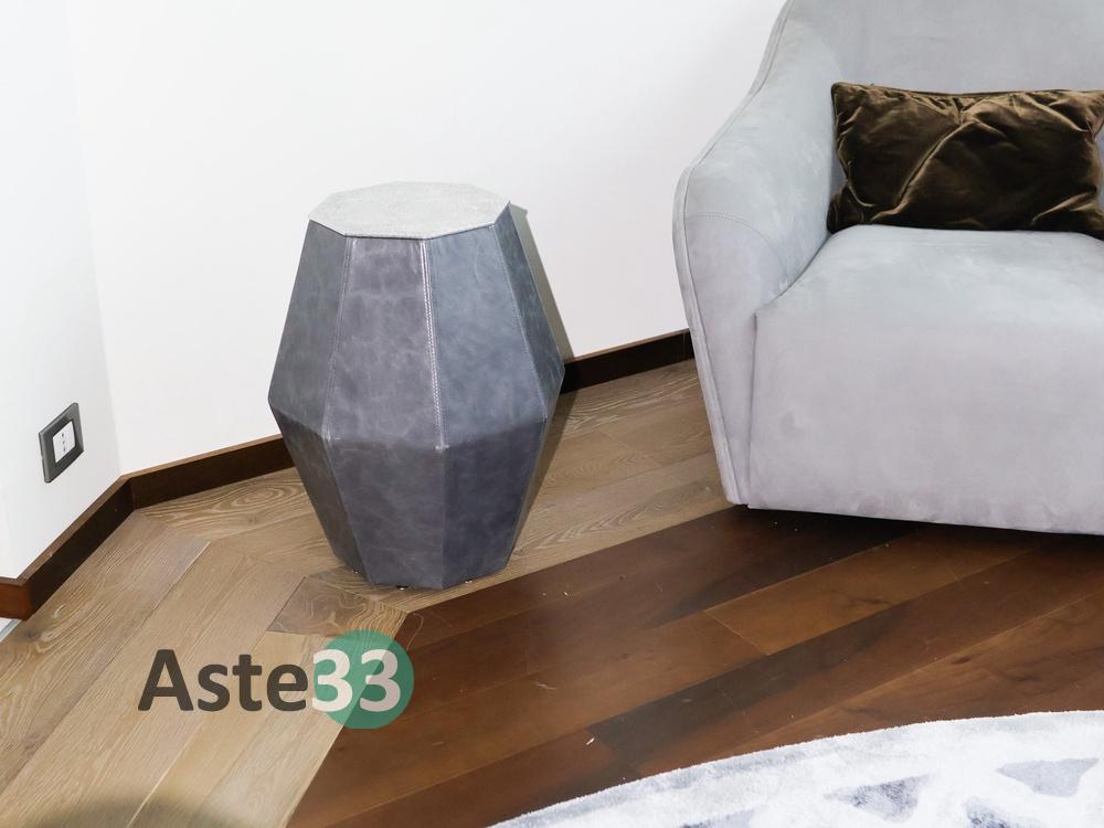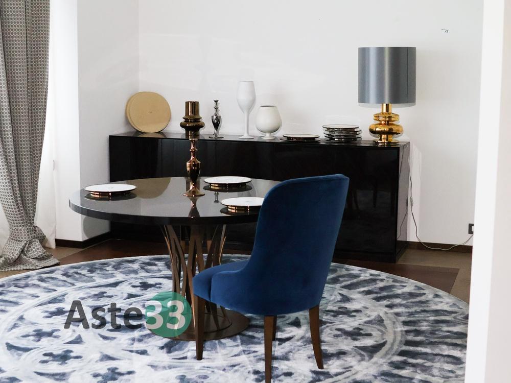 N. 1 tavolo con piano tondo in laccato tinta legno; N. 1 sedia rivestita in velluto Azzurro; N. 1 tappeto tondo diam. 350 cm; N. 1 mobile in laccato tinta legno a cinque ante (rovinato); N. 1 lampada abatjour; N. 6 elementi d'arredo di vario tipo; N. 1 poltrona;Oggettistica.