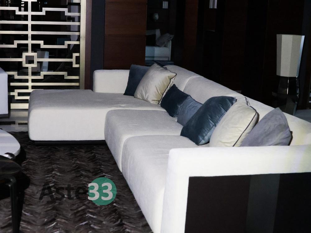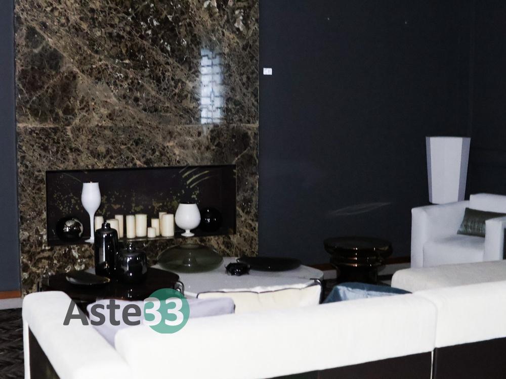 N. 1 divano rivestito in tessuto panna con sceslong; N. 1 poltrona rivestita in alcantara; N. 4 strutture portavaso in ceramica; N. 1 tavolo basso con piano in marmo bianco; N. 1 tavolo basso con piano in legno, N. 1 tavolino in ceramica; N. 10 elementi d'arredo di vario tipo; N. 1 tappeto in tessuto dim. 300x450 cm; N. 1 lampadario a sedici luci; N. 1...