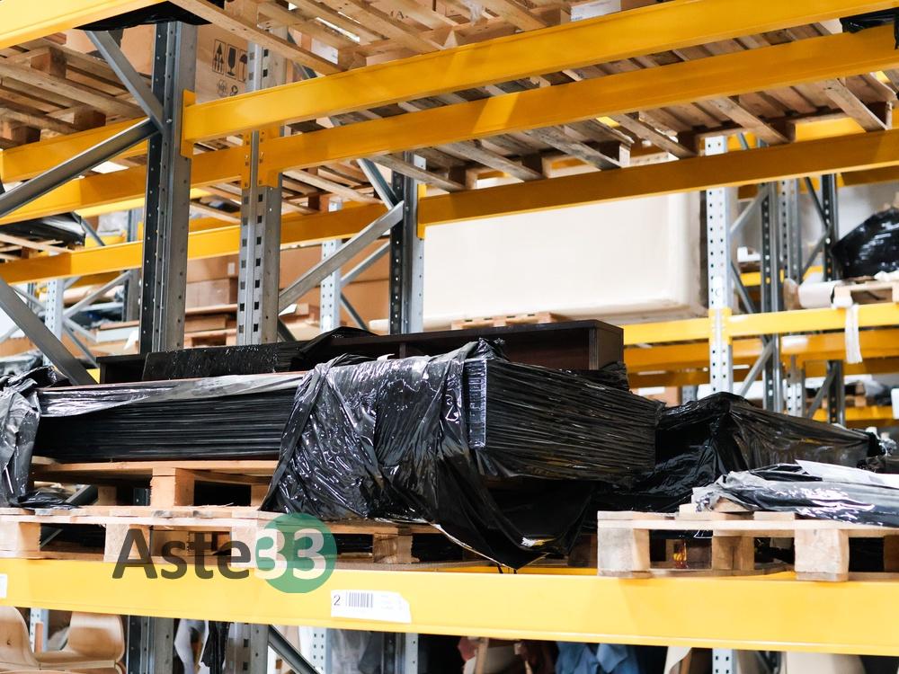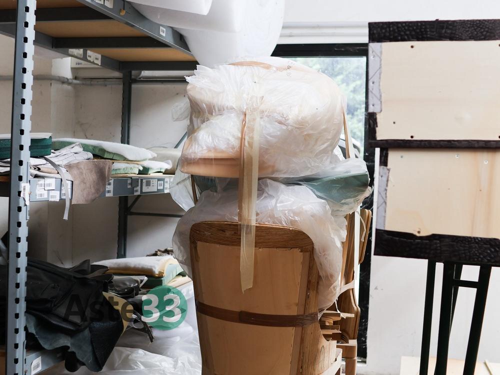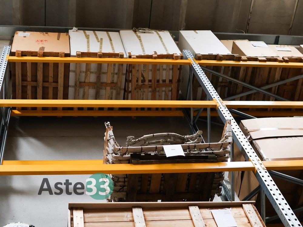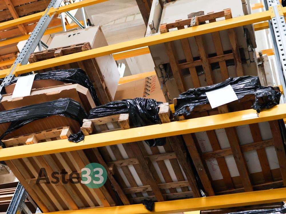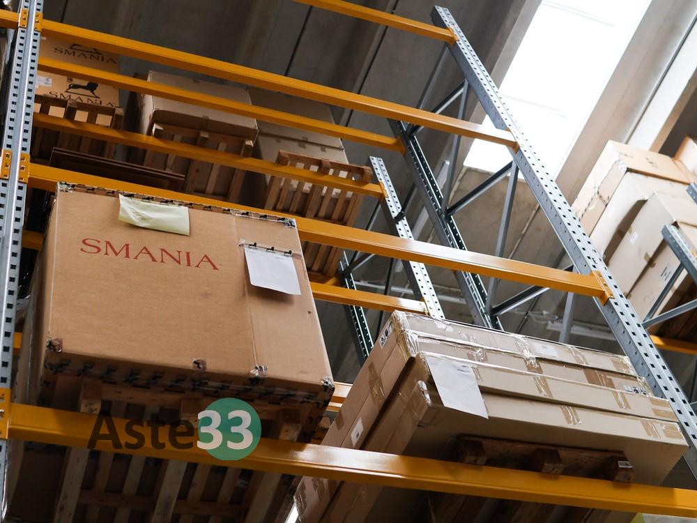 Vari elementi di fiere e vecchi showroom (come ad esempio: mobili a vani a giorno, tavoli, poltrone, divani, elementi di mobili, cornici con specchio, cuscini, mobili vari, scrivanie, sedie, cornici e tappeti); Composizione royal room costituita da: n. 1 poltrona Flora, n. 2 divani imbottiti Ernest, n. 4 cuscini con nervetto dim. 50x50 cm; N. 1 tavolo d'appoggio Orm, diametro 60 cm; N. 1 mobile trucco Grace; N. 1 scrittorio con fianchi e schiena in pelle, inox; N. 1 divano imbottito capitonnè Sir Alex 230; N. 1 tavolo basso Moon 95; N. 2 poltrone Flora; N. 1 tavolo alto rettangolare Rodrigo 210; N. 4 sedie Aura; N. 1 cavallo in bronzo Troy; N. 1 tavolino Capri; N. 1 letto Klizia; N. 1 poltrona Klizia.