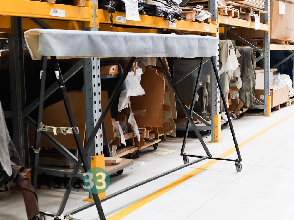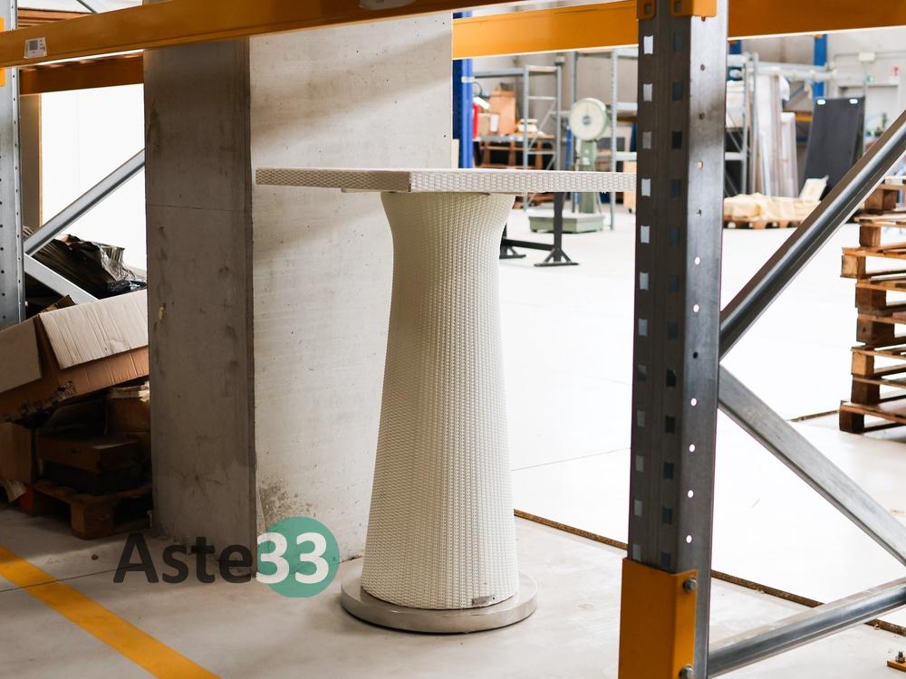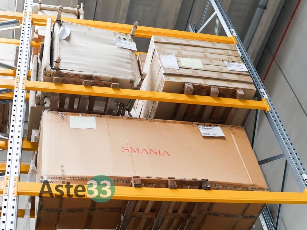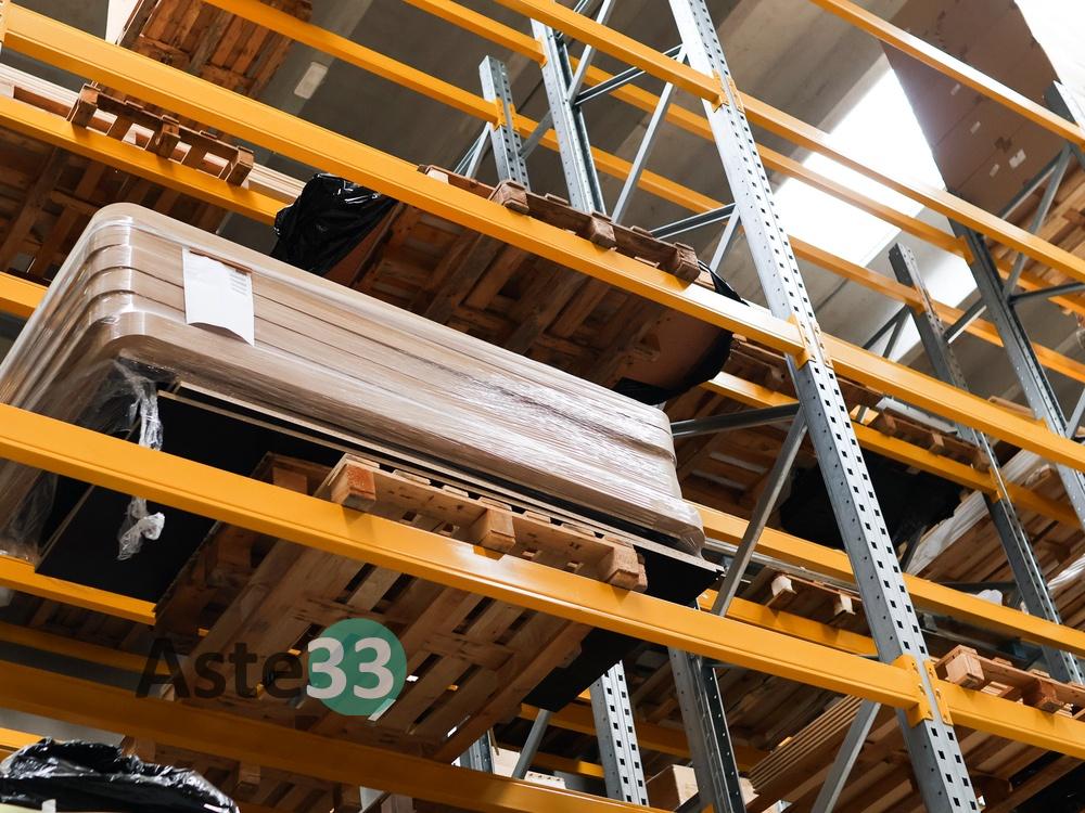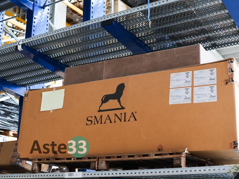 Vari elementi di fiere e vecchi showroom (come ad esempio: mobili a vani a giorno, tavoli, poltrone, divani, elementi di mobili, cornici con specchio, cuscini, mobili vari, scrivanie, sedie, cornici e tappeti); Composizione royal room costituita da: n. 1 poltrona Flora, n. 2 divani imbottiti Ernest, n. 4 cuscini con nervetto dim. 50x50 cm; N. 1 tavolo d'appoggio Orm, diametro 60 cm; N. 1 mobile trucco Grace; N. 1 scrittorio con fianchi e schiena in pelle, inox; N. 1 divano imbottito capitonnè Sir Alex 230; N. 1 tavolo basso Moon 95; N. 2 poltrone Flora; N. 1 tavolo alto rettangolare Rodrigo 210; N. 4 sedie Aura; N. 1 cavallo in bronzo Troy; N. 1 tavolino Capri; N. 1 letto Klizia; N. 1 poltrona Klizia.