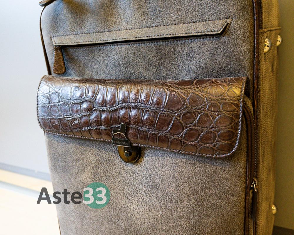 Trolley con rotelle, in pelle marrone con inserti cocco, interno in pellame rosso, misura 52x34.