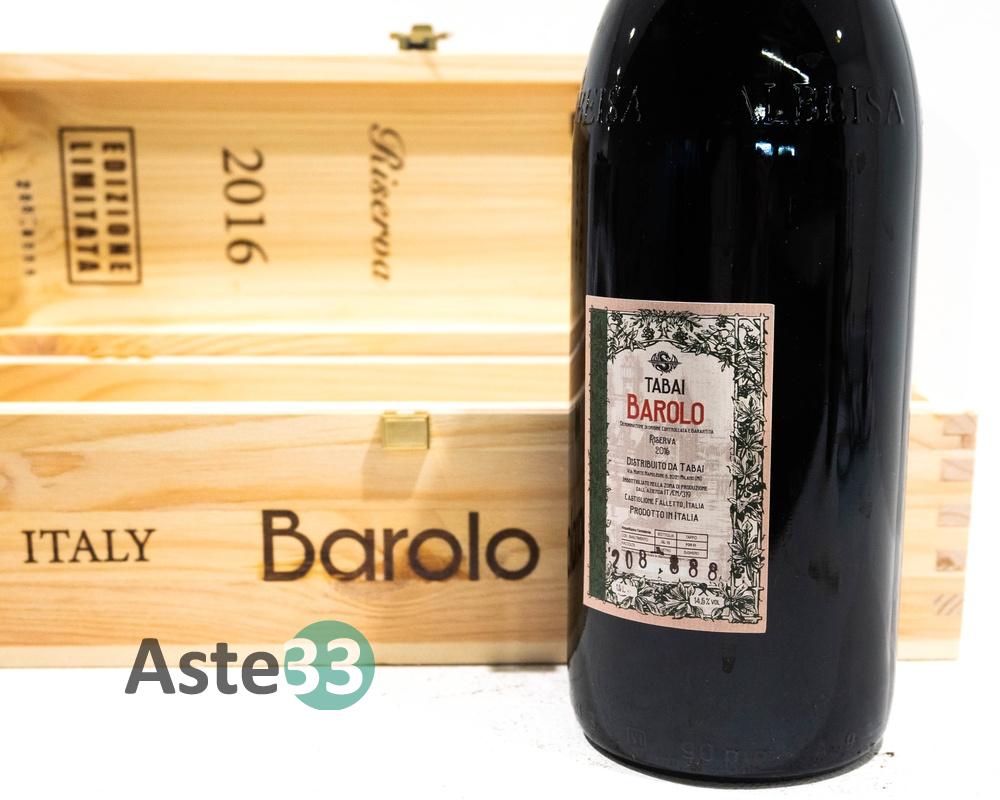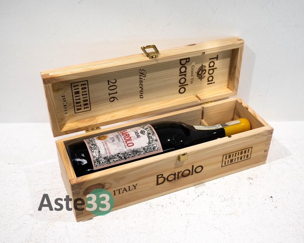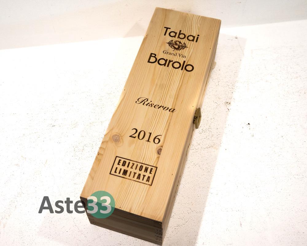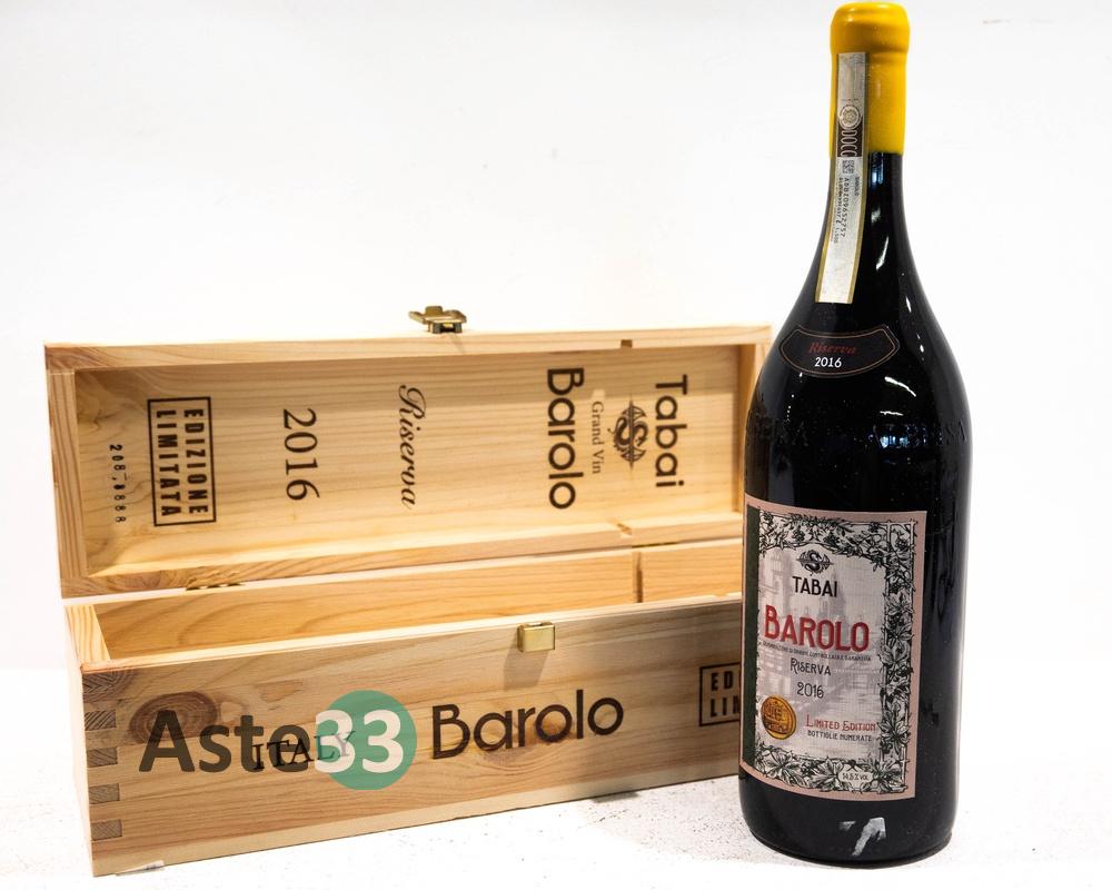 Bottiglia Magnum 1,5L di Barolo Gran Vin Tabai, Riserva 2016 in edizione limitata n. 208-8888, vol.14,5% DOCG. È presente la confezione in legno.