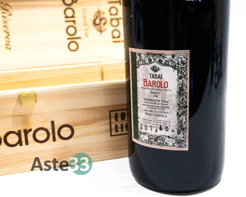 Bottiglia Magnum 1,5L di Barolo Gran Vin Tabai, Riserva 2016 in edizione limitata n. 201-8888, vol.14,5% DOCG. È presente la confezione in legno.