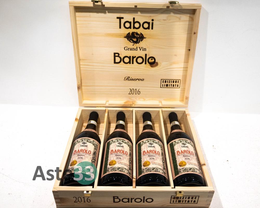 Cassetta di legno contenente n.4 bottiglie (0,75L) di Barolo Gran Vin Tabai, Riserva 2016 in edizione limitata, vol.14,5% DOCG.Bottiglia numerata: 1194/8888Confezione in legno.