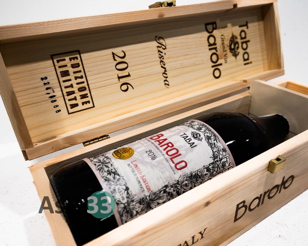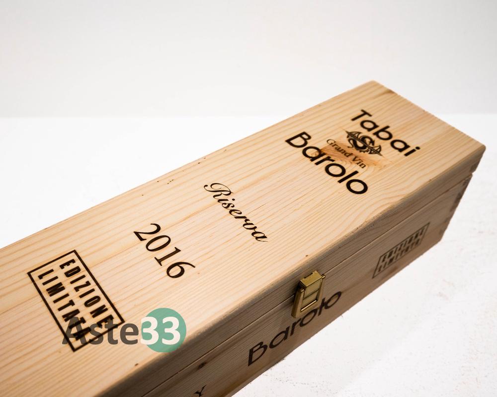 Bottiglia Magnum 1,5L di Barolo Gran Vin Tabai, Riserva 2016 in edizione limitata n. 224-8888, vol.14,5% DOCG. È presente la confezione in legno che presenta un lieve difetto.