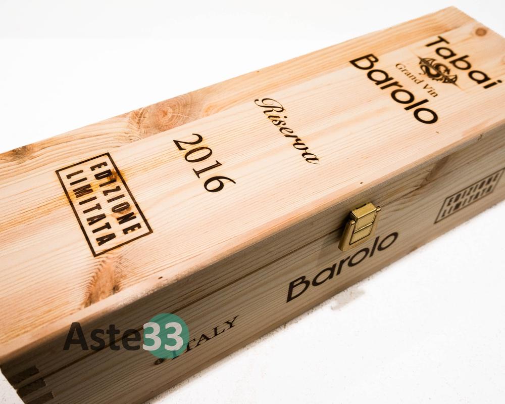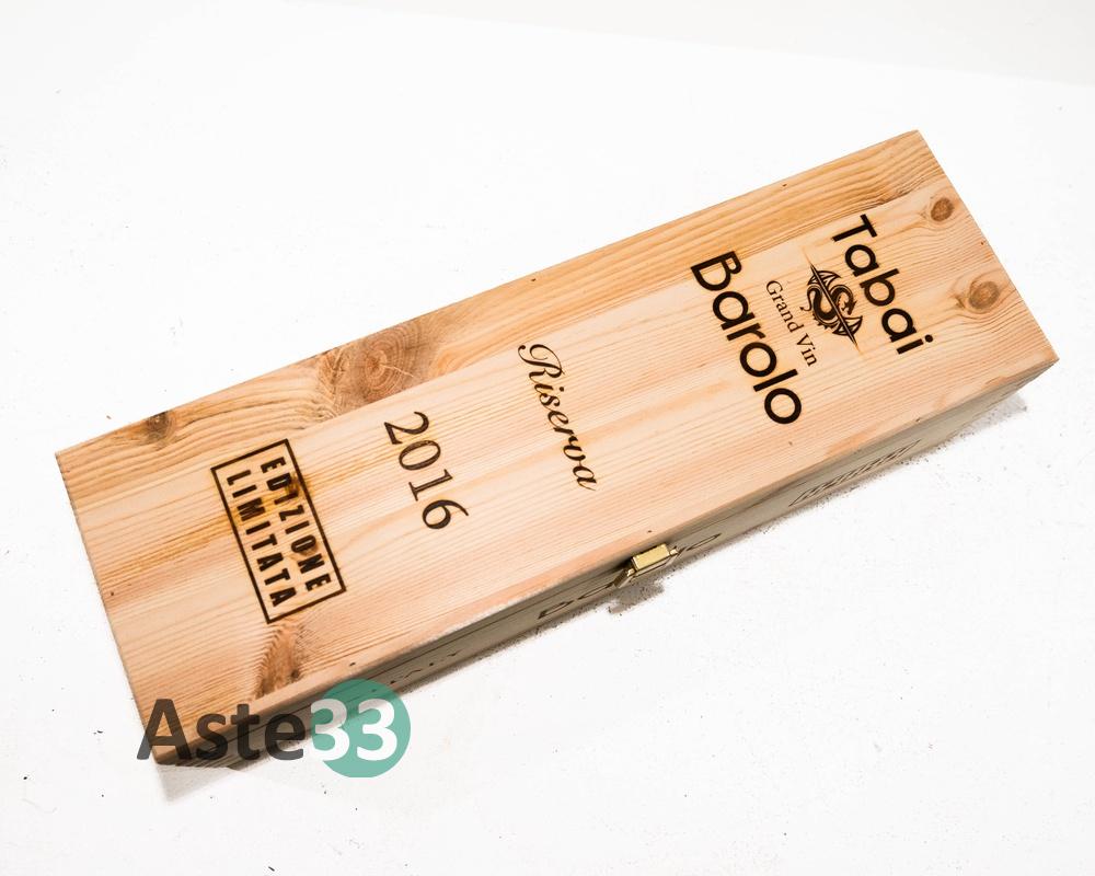 Bottiglia Magnum 1,5L di Barolo Gran Vin Tabai, Riserva 2016 in edizione limitata n. 223-8888, vol.14,5% DOCG. È presente la confezione in legno.